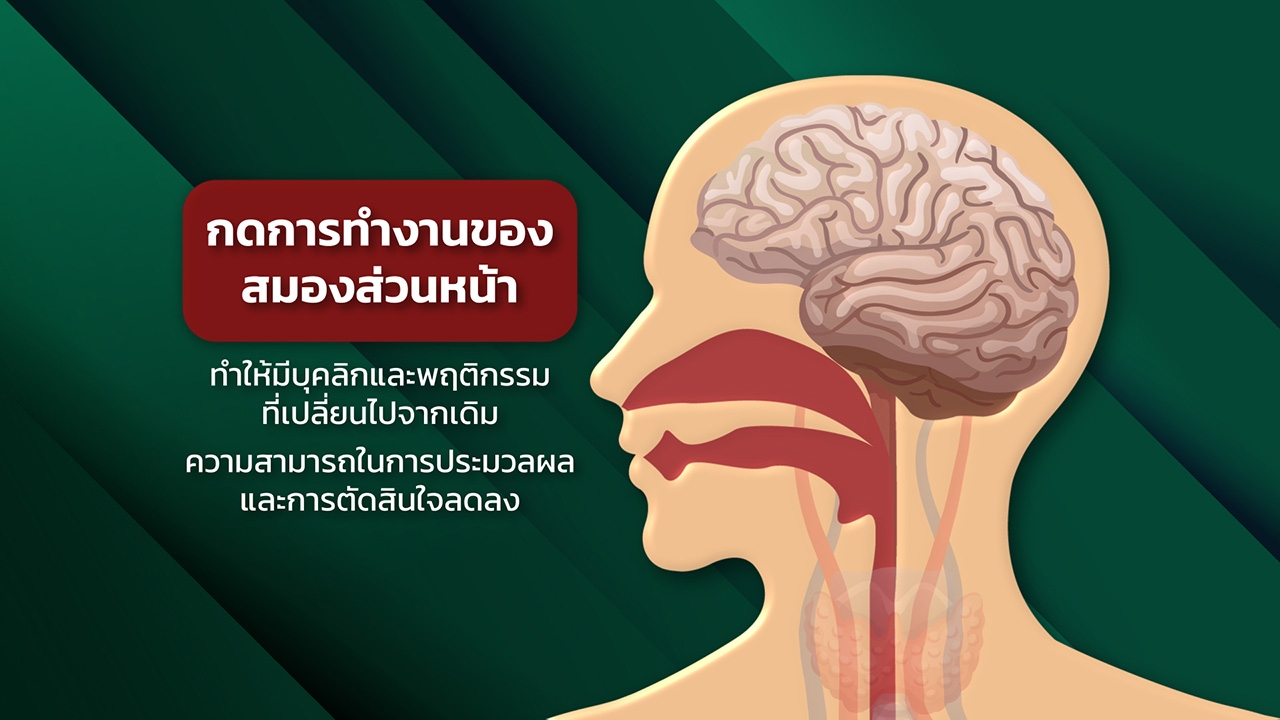ทั้งในสมองส่วนหน้า ที่ทำหน้าที่ควบคุม ความคิด บุคลิก พฤติกรรม ทำให้ผู้ดื่มมีความสามารถในการตัดสินใจ หรือการประมวลผลต่อเรื่องต่างๆ ลดลง โดยเฉพาะอย่างยิ่งทักษะในด้านการขับขี่ ทำให้ต้องใช้ระยะเบรก และระยะการตัดสินใจที่เพิ่มขึ้น