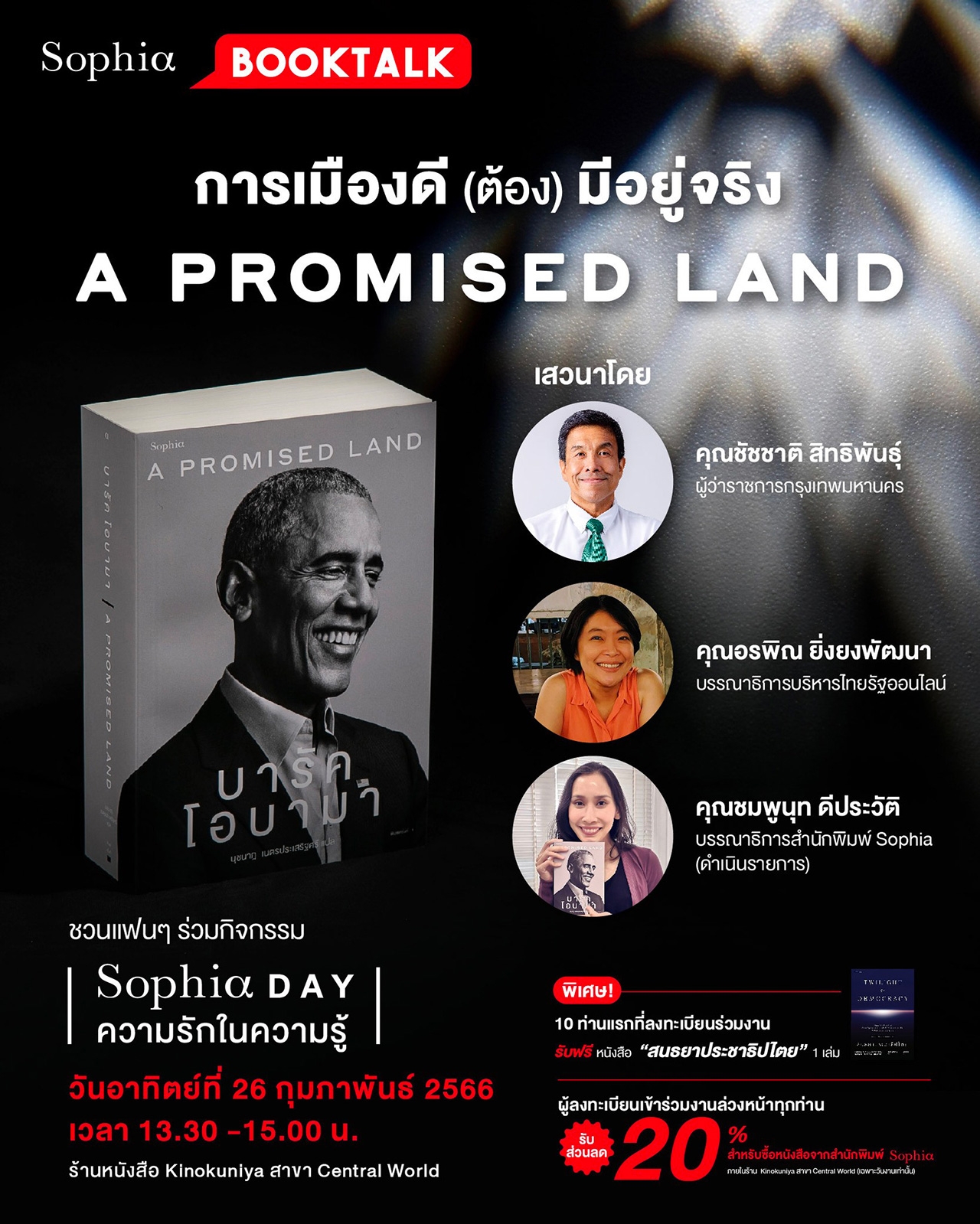 งานเสวนา “A Promised Land: การเมืองดี (ต้อง) มีอยู่จริง” จัดขึ้นเวลา 13.30-15.00 น. ติดตามรายละเอียดเพิ่มเติมที่ Facebook: Sophia Publishing
