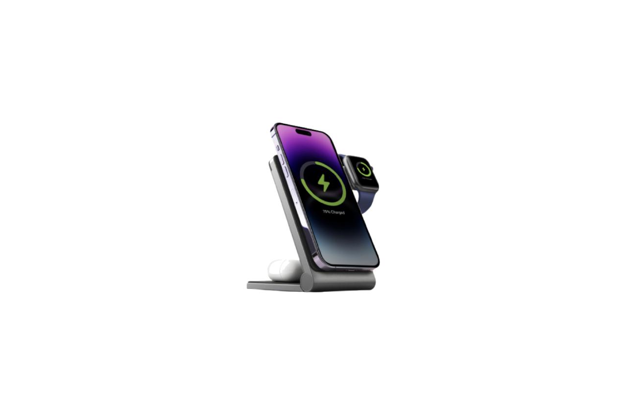แท่นชาร์จแม่เหล็กไร้สายแบบ 3 in 1 รุ่น MagTrio ผลิตจาก Anodized Aluminium มีความแข็งแรง ทนทาน มีแผ่นรองกันลื่นมาให้ในตัว ชาร์จแบตเตอรี่ได้พร้อมกัน 3 อุปกรณ์ ทั้ง iPhone AirPods และ Apple Watch ด้วยกำลังไฟสูงสุด 15 วัตต์ และรองรับ MagSafe อีกด้วย