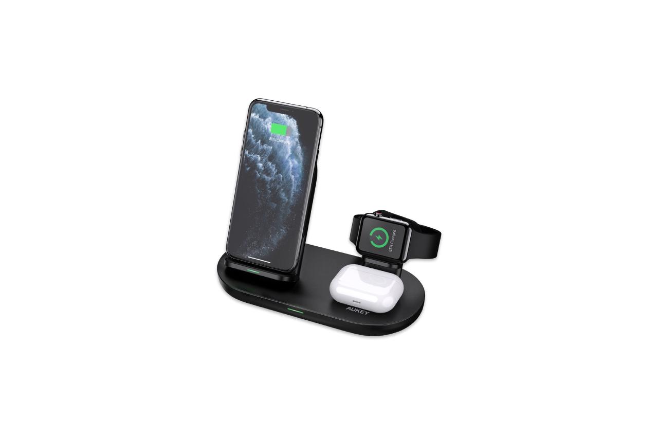 แท่นชาร์จไร้สาย Aukey รุ่น LC-A3 ใช้งานได้แบบ 3 in 1 ชาร์จพร้อมกันได้ถึง 3 อุปกรณ์ รองรับการชาร์จ iPhone AirPods และ Apple Watch รองรับการใช้งาน Fast Wireless Charging โดยจ่ายไฟได้สูงสุด 10 วัตต์ นอกจากนี้ยังมีไฟ LED แสดงสถานะการใช้งานอีกด้วย