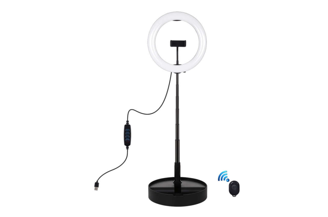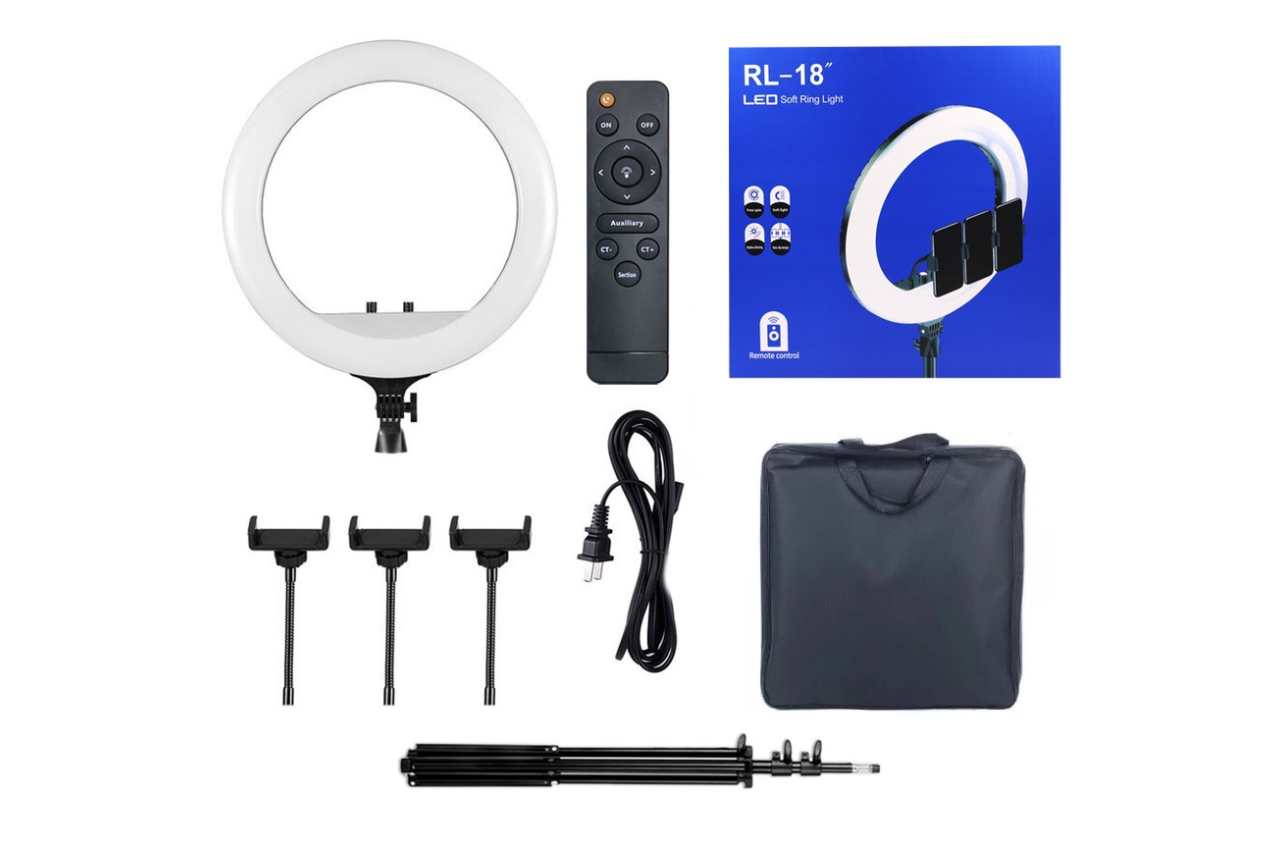 ไฟไลฟ์สดพร้อมอุปกรณ์ติดตั้งแบบครบเซตจาก Mobile Geek รุ่น RL ไฟ LED Ring Light มีให้เลือก 3 ขนาดคือ 14,18 และ 21 นิ้ว ให้ความสว่างสูงสุดจากหลอดไฟ LED 560 ดวง กำลังไฟที่ 65 วัตต์ มีรีโมตสำหรับใช้ปรับเพิ่มลดแสงให้เข้ากับสภาพแวดล้อมได้ สามารถใช้เป็นไฟแต่งหน้าได้ในตัว มีที่จับมือถือให้ใช้งานพร้อมกันได้ถึง 3 เครื่อง เสาปรับระดับความสูงได้มากถึง 2.1 เมตร