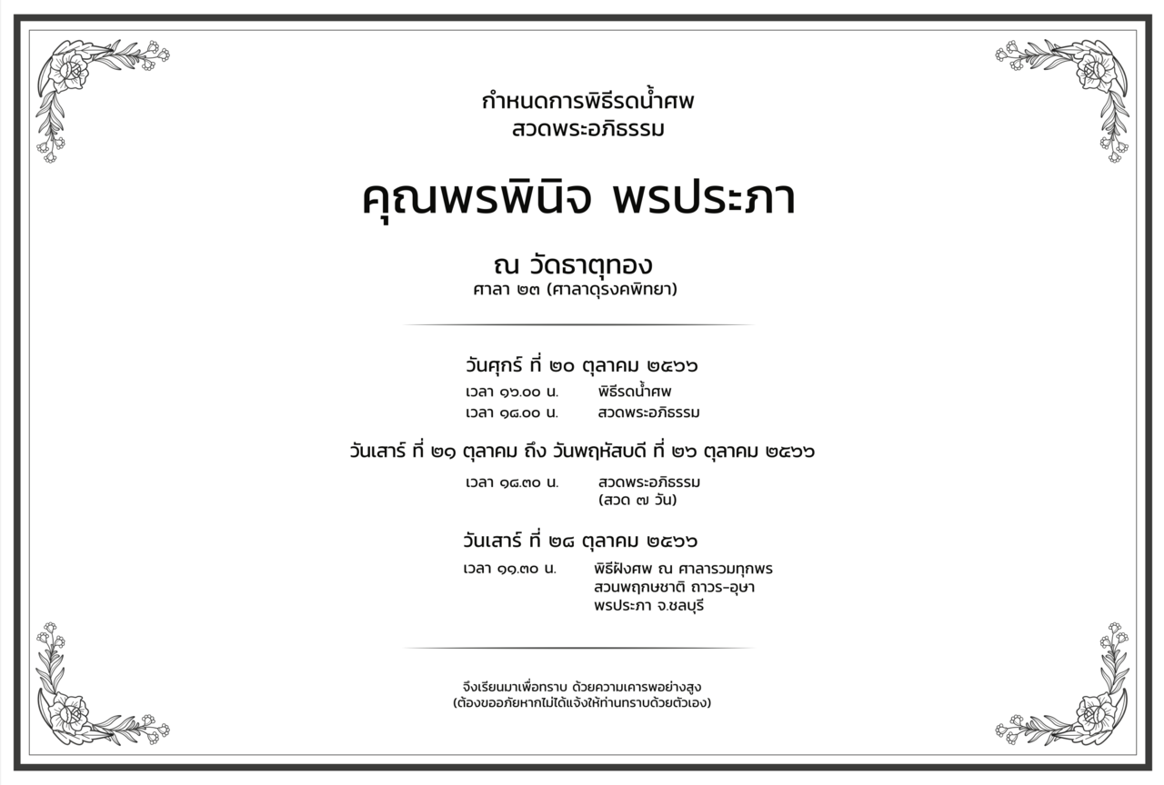 ทั้งนี้ครอบครัว พรประภา ได้กำหนดจัดพิธีบำเพ็ญกุศลขึ้น ณ วัดธาตุทอง ศาลาดุรงคพิทยา มีกำหนดการดังนี้