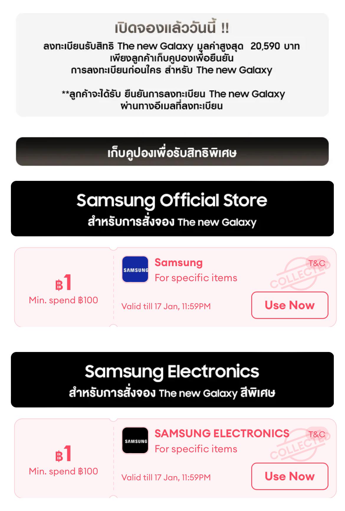 สำหรับการลงทะเบียนสั่งจอง Samsung S24 Series บน Lazada สามารถเข้าไปเก็บคูปองได้ที่ร้านค้าทางการทั้ง Samsung Official Store และ Samsung Eletronics ตั้งแต่วันนี้ถึงวันที่ 17 มกราคม 2567 เวลา 23.59 น. หลังจากกดรับคูปองเรียบร้อยแล้ว จะได้รับอีเมล “ยืนยันสิทธิ์การลงทะเบียนเรียบร้อย” ผ่านอีเมลที่ลงทะเบียนไว้ ภายใน 7 วัน และสามารถเข้ามากดจอง Samsung S24 Series ก่อนใครได้ในวันที่ 18 มกราคม 2567 ตั้งแต่เวลา 01.00 น.