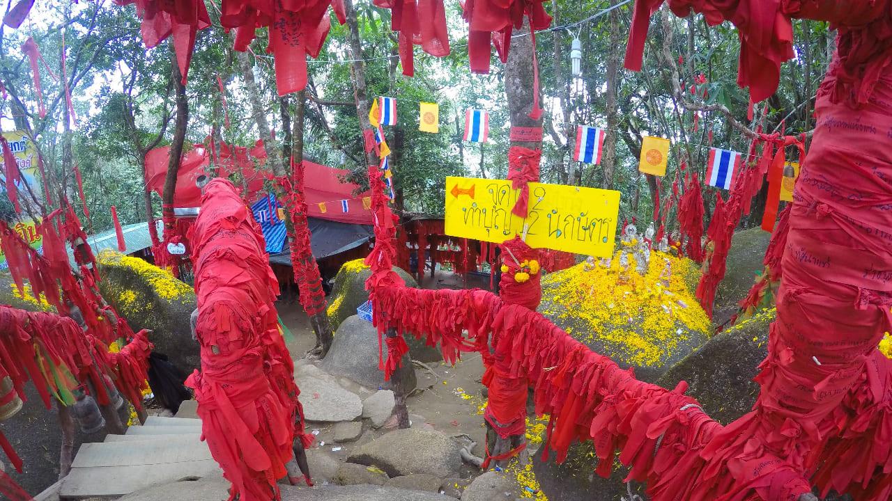 ทั้งนี้ จุดกราบไหว้สิ่งศักดิ์สิทธิ์อีกหลายจุด แต่จุดไฮไลต์คือ บริเวณรอยพระบาท และลานผ้าแดง ที่เดิมทีบริเวณเขาคิชฌกูฏจันทบุรีมีการผูกผ้าแดงเพื่อเป็นสัญลักษณ์ว่าบริเวณนี้เป็นจุดเขตแดน สูง ลาดชัน และอันตราย แต่ปัจจุบันกลายเป็นอีกหนึ่งจุดที่นักท่องเที่ยว และสายบุญนิยมไปเขียนคำอธิษฐานลงบนผ้าแดง เพื่อขอให้สิ่งที่ตนเองปรารถนาสัมฤทธิผล