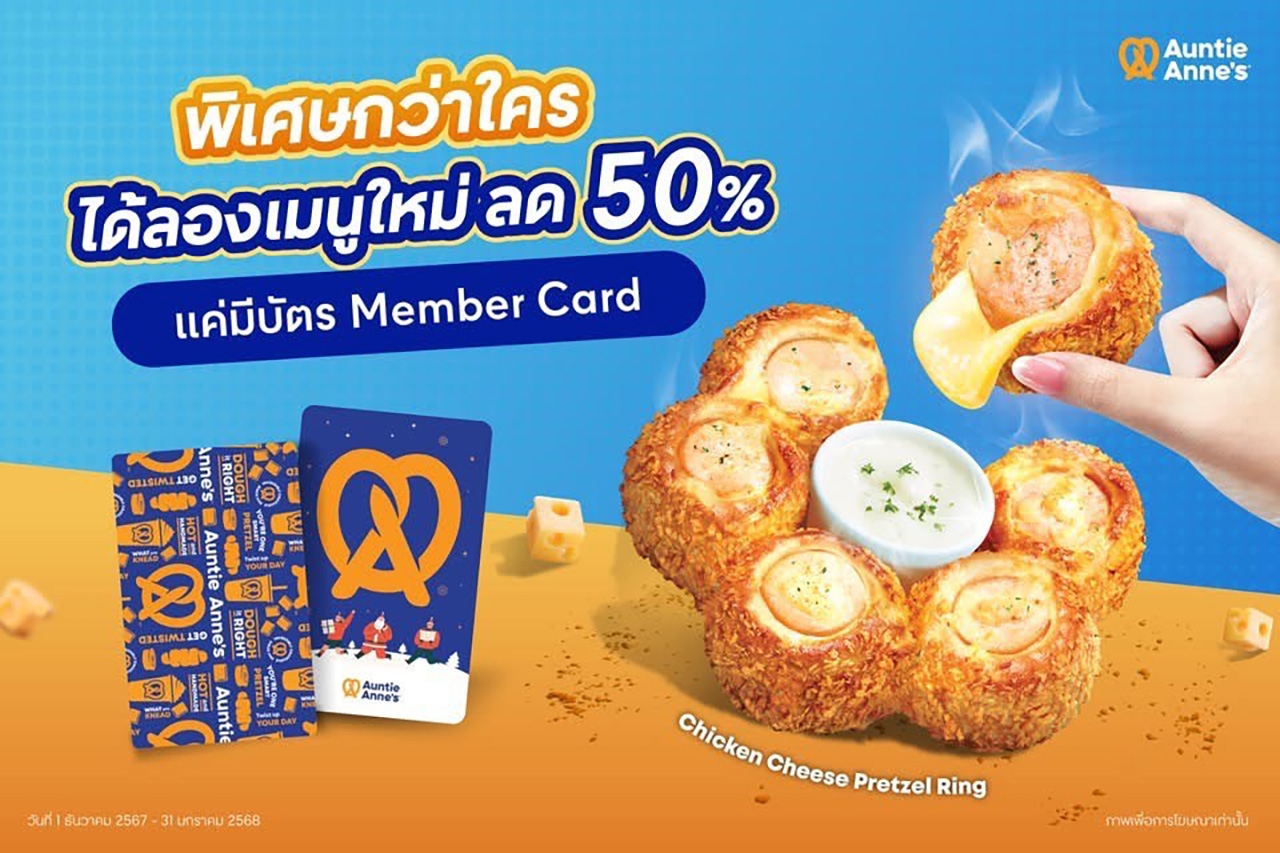 นอกจากนี้ ยังพร้อมเปิดตัว “Auntie Anne’s Card” บัตรสมาชิกที่แฟนคลับทุกคนรอคอย พร้อมยกระดับความผูกพันระหว่างแบรนด์กับลูกค้าให้แน่นแฟ้นยิ่งขึ้น หลังจากที่ Pretzel Club เคยเป็นที่ชื่นชอบของแฟน ๆ เพรทเซล โดยครั้งนี้ Auntie Anne’s กลับมาสร้างประสบการณ์ที่พิเศษกว่าเดิม ด้วยสิทธิประโยชน์สุดคุ้มมูลค่ารวมกว่า 20,000 บาท เจาะกลุ่มลูกค้าที่หลงใหลในเพรทเซล และที่ต้องการสิทธิพิเศษที่ตอบโจทย์ความคุ้มค่าในทุกวัน