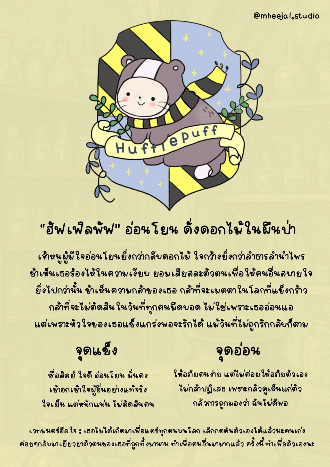 ในแต่ละคำถามจะมีตัวเลือก 4 ข้อ ให้คุณเลือกคำตอบที่สะท้อนความเป็นตัวคุณมากที่สุด เมื่อตอบครบทุกข้อ ควิซที่ออกแบบโดย mheejai.studio จะเปิดเผยว่าคุณคือสมาชิกของบ้านกริฟฟินดอร์, ฮัฟเฟิลพัฟ, สลิธีริน หรือเรเวนคลอ พร้อมทั้งอธิบายคุณลักษณะเด่น จุดแข็ง และจุดอ่อนของสมาชิกแต่ละบ้านอย่างละเอียด