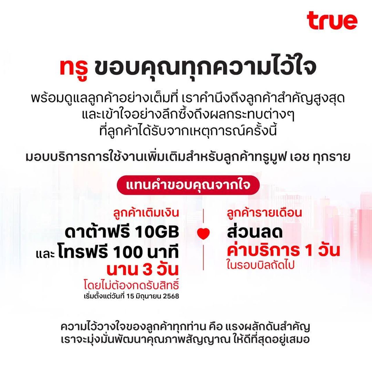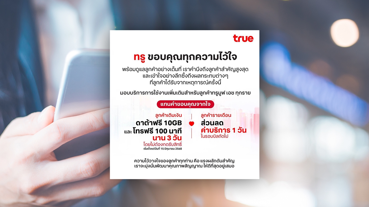 ทรู ขอขอบคุณอีกครั้งจากใจผู้บริหารและทีมงานทุกคนที่ให้โอกาสทรูได้ดูแลทุกท่านอย่างต่อเนื่องต่อไป ความไว้วางใจของลูกค้าทุกท่านคือแรงผลักดันสำคัญที่จะทำให้เรามุ่งมั่นพัฒนาบริการอย่างต่อเนื่อง เพื่อดูแลคุณภาพสัญญาณของทรูให้ดีที่สุดอยู่เสมอ และขออภัยอีกครั้งสำหรับความไม่สะดวกที่เกิดขึ้นในครั้งนี้