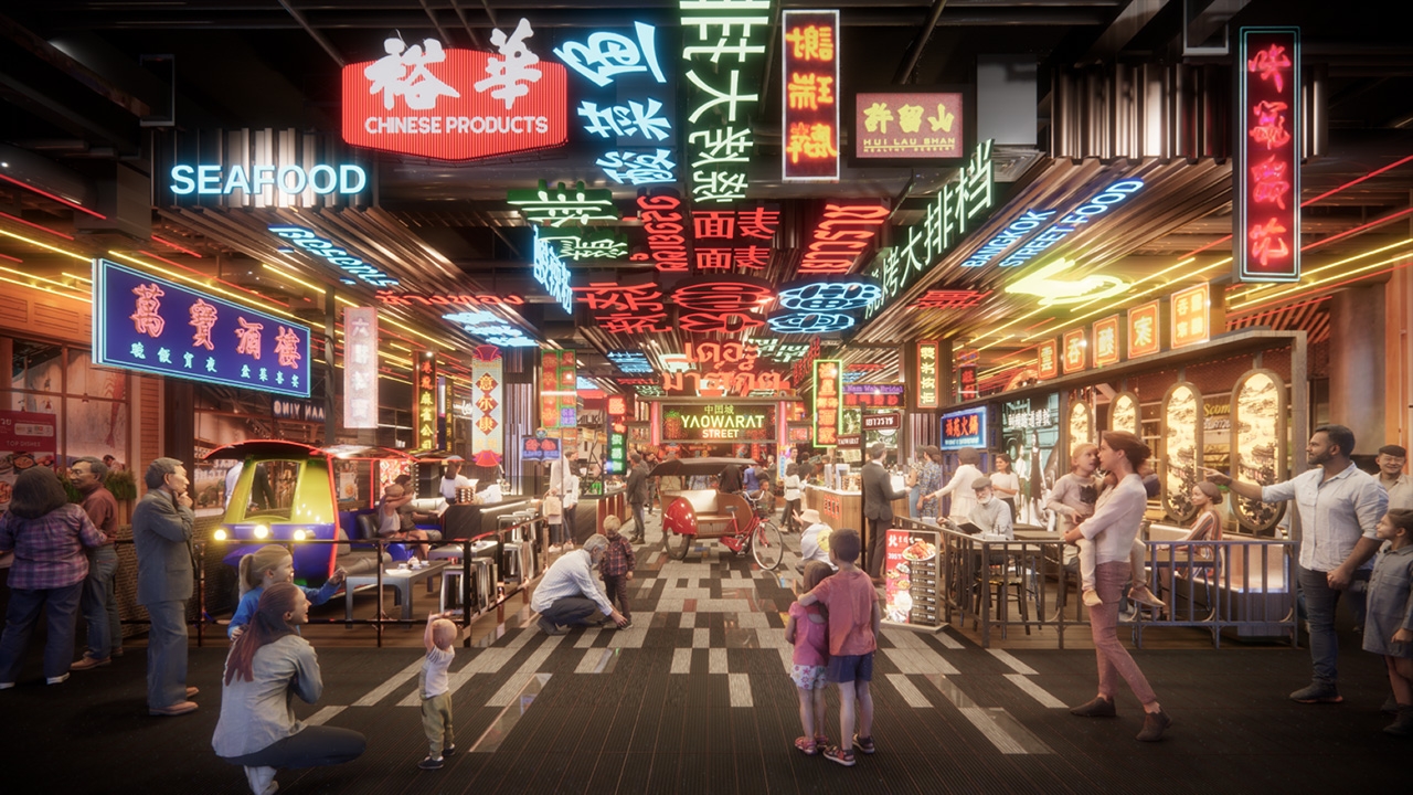 2. PEOPLE & LIFESTYLE ไอเดียสำหรับการออกแบบ คือการสะท้อนให้เห็นถึงวิถีชีวิตที่พบเห็นได้บ่อยของผู้คนในเยาวราช การดีไซน์โซนนี้ในรูปแบบร้าน “สภากาแฟ” จึงถือเป็นสัญลักษณ์สำคัญในการถ่ายทอดมุมแห่งการนัดพบแบ่งปันเรื่องราวมิตรภาพ รอยยิ้ม ความสนุกสนานเป็นกันเอง ในบรรยากาศโรงเตี๊ยม