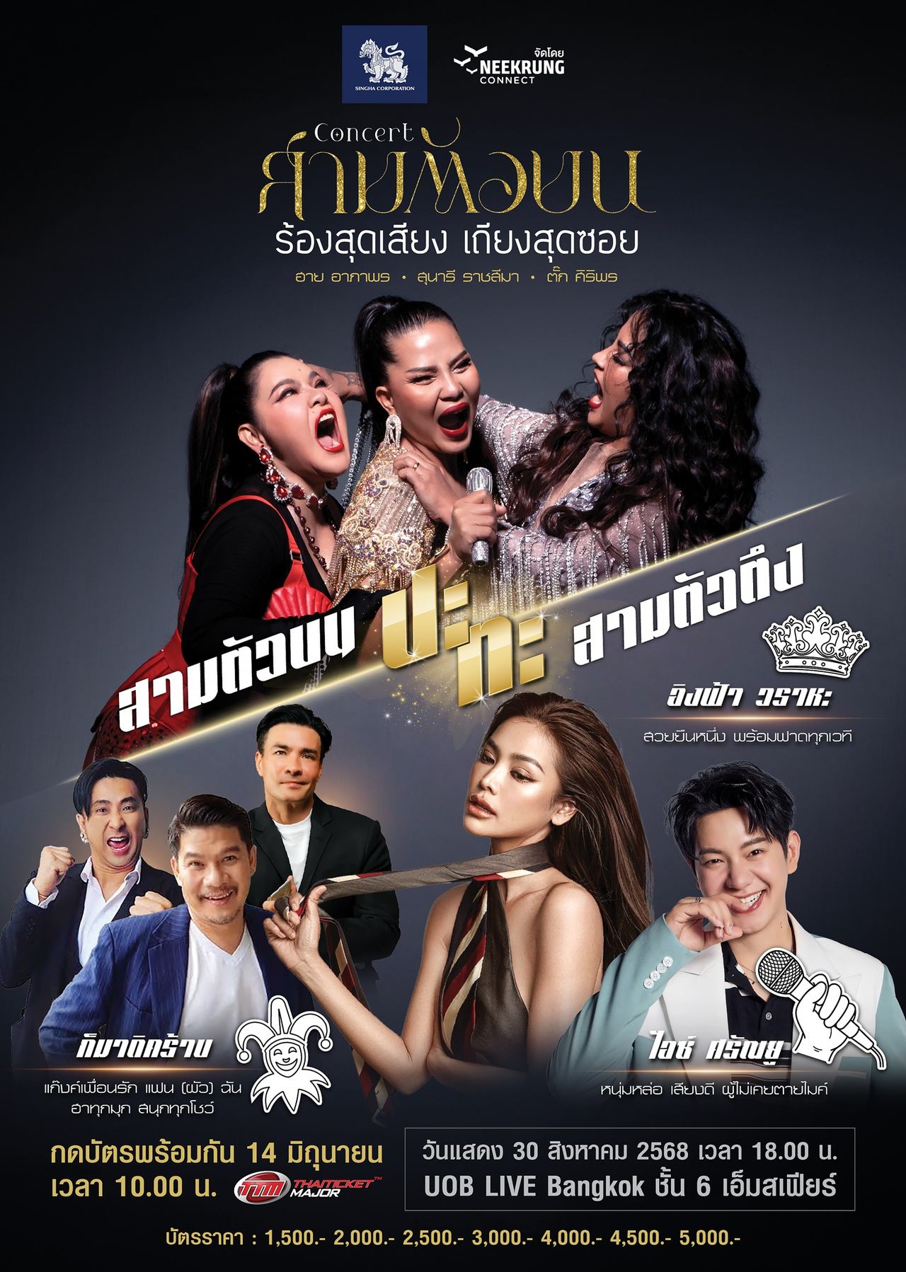 เตรียมพบกับคอนเสิร์ตปี 2568 ที่จะมอบความสุขให้แฟนๆ ชาวไทยใน "สามตัวบน คอนเสิร์ต" ที่นำทีมโดย 3 เพื่อนซี้สุดฮา ตั๊ก-สุนารี-ฮาย พร้อมแขกรับเชิญสุดพิเศษ "อิงฟ้า วราหะ" บนเวทีคอนเสิร์ตสุดแซ่บที่จัดเต็มแบบสุดๆ