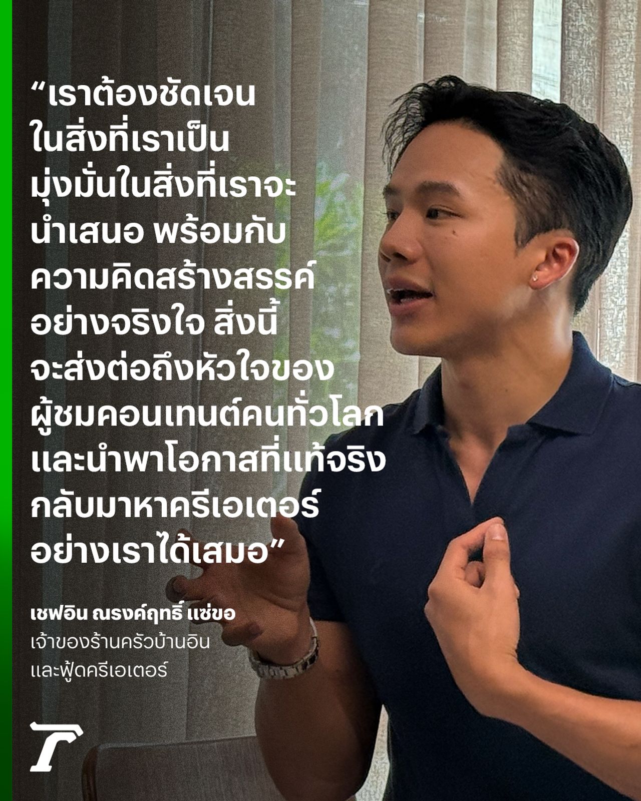 เชฟอิน ณรงค์ฤทธิ์ แซ่ขอ เจ้าของร้านครัวบ้านอิน ได้แชร์แนวคิดการเป็นครีเอเตอร์ให้ฟังอย่างจริงใจว่า “การเป็นครีเอเตอร์สิ่งสำคัญ คือ การสร้างความชัดเจน และเป็นตัวของตัวเองในสิ่งที่คุณทำ เพราะความเป็นตัวเองจะทำให้คนเชื่อมั่น ไม่ว่าจะนำเสนออะไร อย่างผมเองการเลือกคอนเทนต์มาทำการรีวิวควรอยู่บนพื้นฐานความจริงใจ เป็นตัวเอง โดยยังคำนึงถึงผู้ประกอบการ เน้นดึงข้อดี หรือแนะนำในมุมที่สร้างสรรค์มากกว่าการติเตียน