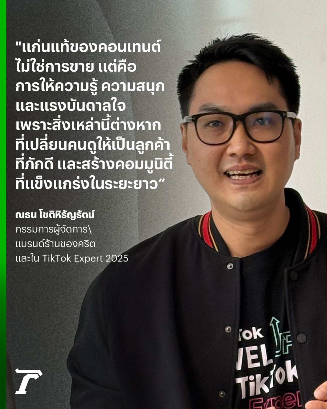 ในส่วนของ ณธน โชติหิรัญรัตน์ กรรมการผู้จัดการแบรนด์ร้านของคริต โดย ชาคริต แย้มนาม และในฐานะ TikTok Expert 2025 เล่าเทคนิคเกี่ยวกับการขายของผ่านแพลตฟอร์มวิดีโอสั้นในปัจจุบันว่า "แก่นแท้ของคอนเทนต์บน TikTok ไม่ใช่การขายของแต่คือ การให้ความรู้ ให้ความสนุก ให้แรงบันดาลใจ สิ่งเหล่านี้ต่างหากที่เปลี่ยนคนดูให้กลายเป็นลูกค้าที่ภักดี เพราะ เรากำลังอยู่ในยุคที่คอนเทนต์สร้างคอมเมิร์ซ และคอมมูนิตี้ ลูกค้าบน TikTok ไม่ได้เข้ามาเพื่อช้อป แต่เข้ามาเพราะอยากสนุก อยากรู้ อยากรู้สึกเป็นส่วนหนึ่งของเรื่องราว ทำให้การซื้อขายจึงเกิดขึ้นโดยธรรมชาติ เมื่อเราสื่อสารด้วยความจริงใจ"
