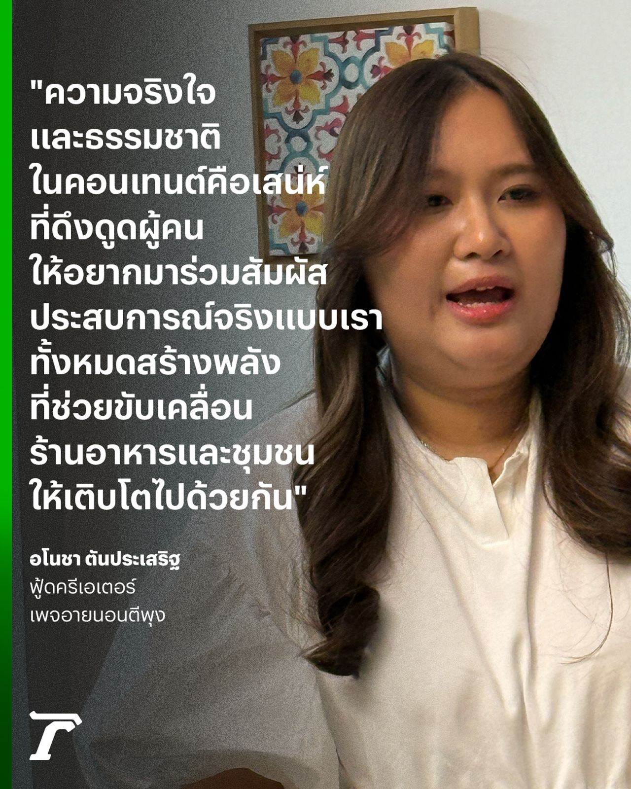 อโนชา ตันประเสริฐ เพจอายนอนตีพุง ฟู้ดครีเอเตอร์อารมณ์ดี ได้กล่าวถึงเทรนด์ของผู้ชม และครีเอเตอร์สายอาหารในปัจจุบันว่า “คอนเทนต์อาหารที่ได้รับความนิยมตอนนี้คือการนำเสนอแบบเรียลๆ จริงใจไม่ต้องปรุงแต่ง กลายเป็นอีกหนึ่งมุมมอง และเสน่ห์ที่สำคัญ ทำให้คอนเทนต์อาหารไทยของเราไปไกลเกินคาด ซึ่งส่งผลดีต่อครีเอเตอร์ ผู้ประกอบการ ผู้ชม รวมถึงส่งต่ออาหารไทยให้ต่อยอดไปไกลได้มากยิ่งขึ้น”