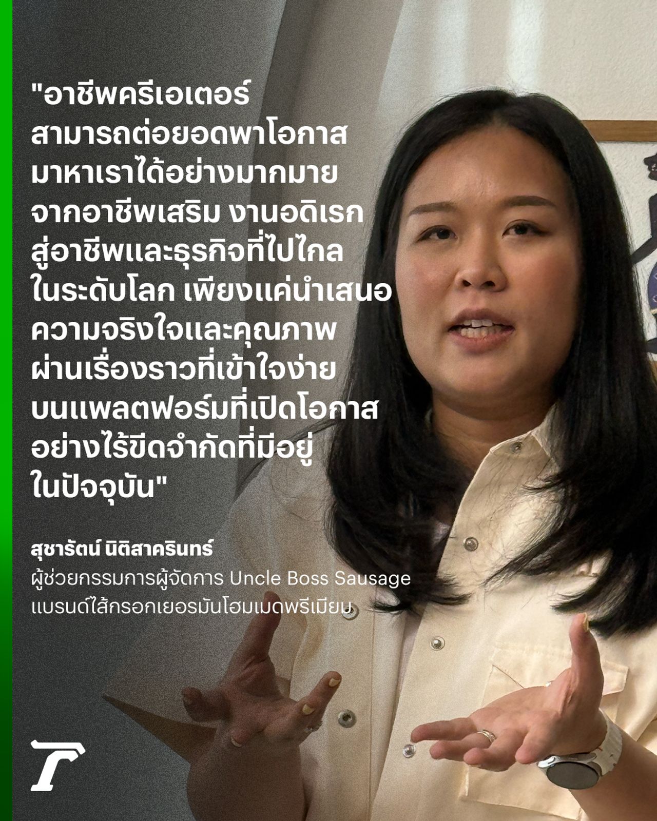 สุชารัตน์ นิติสาครินทร์ ผู้ช่วยกรรมการผู้จัดการ Uncle Boss Sausage แบรนด์ไส้กรอกเยอรมันโฮมเมดพรีเมียม เล่าถึงธุรกิจของตนเองผ่านวิถีครีเอเตอร์จาก TikTok ที่เข้ามาต่อยอดธุรกิจว่า “การเข้าสู่ TikTok ไม่ถึงปี ทำให้ค้นพบลูกค้ากลุ่มใหม่ในต่างประเทศที่ไม่เคยคาดคิด แพลตฟอร์มวิดีโอสั้นเปิดโอกาสให้ธุรกิจเล็กๆ ของเราเป็นที่รู้จักทั่วประเทศ รวมถึงลูกค้าต่างประเทศที่มาเที่ยวเมืองไทย ทำให้ยอดขายเราโตกว่า 50% ภายในปีแรก นักท่องเที่ยวหลายประเทศบอกว่าเจอร้านเราจาก TikTok แล้วมาซื้อเป็นของฝากจากประเทศไทย แน่นอนว่าการใช้แพลตฟอร์มวิดีโอสั้นในการทำการตลาด ทำให้เรามียอดขายสม่ำเสมอและขยายฐานลูกค้าได้กว้างขึ้น วันนี้เราเพิ่มพนักงานจาก 5 เป็น 12 คน และจะขยายไปตลาดต่างประเทศภายในปีนี้”