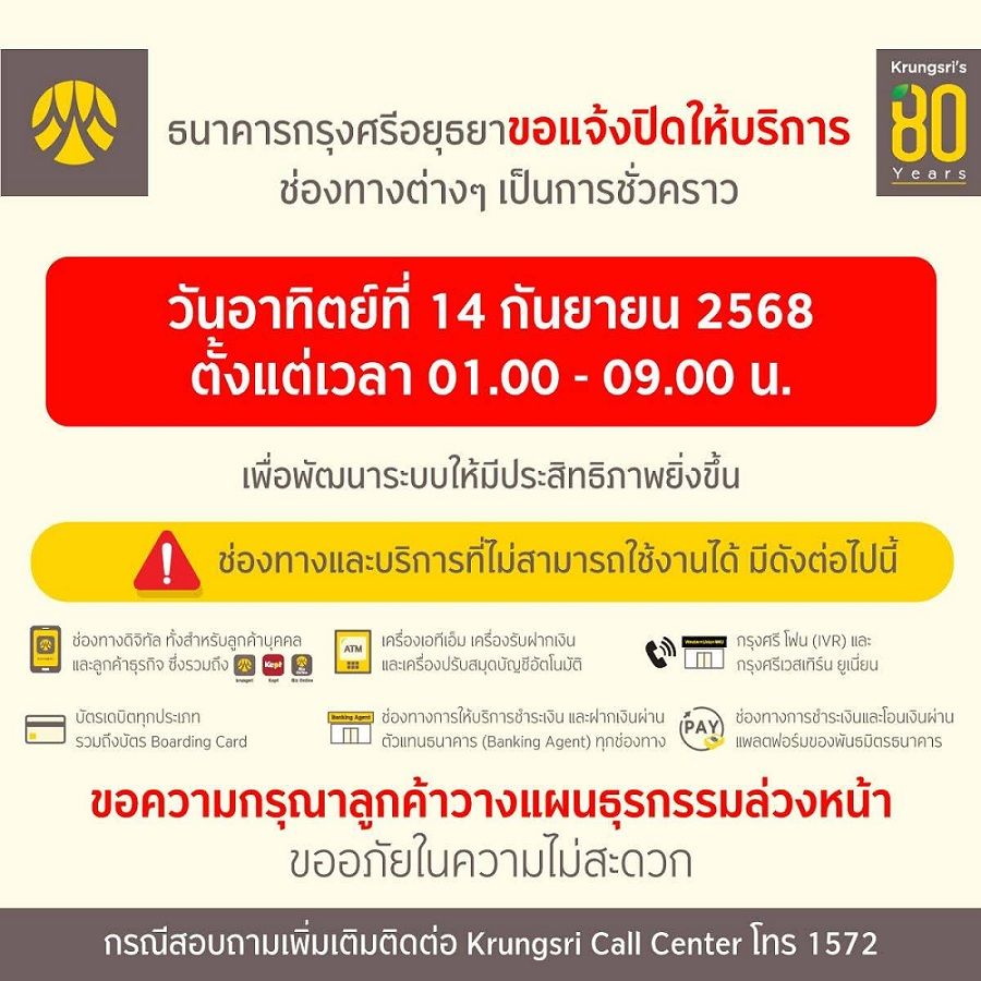 ธนาคารกรุงศรีอยุธยา (BAY) ได้แจ้งปิดปรับปรุงระบบ ในวันที่ 14 กันยายน 2568 เวลา 01:00 - 09:00 น. ทำให้ใช้บริการต่างๆ ไม่ได้ดังนี้