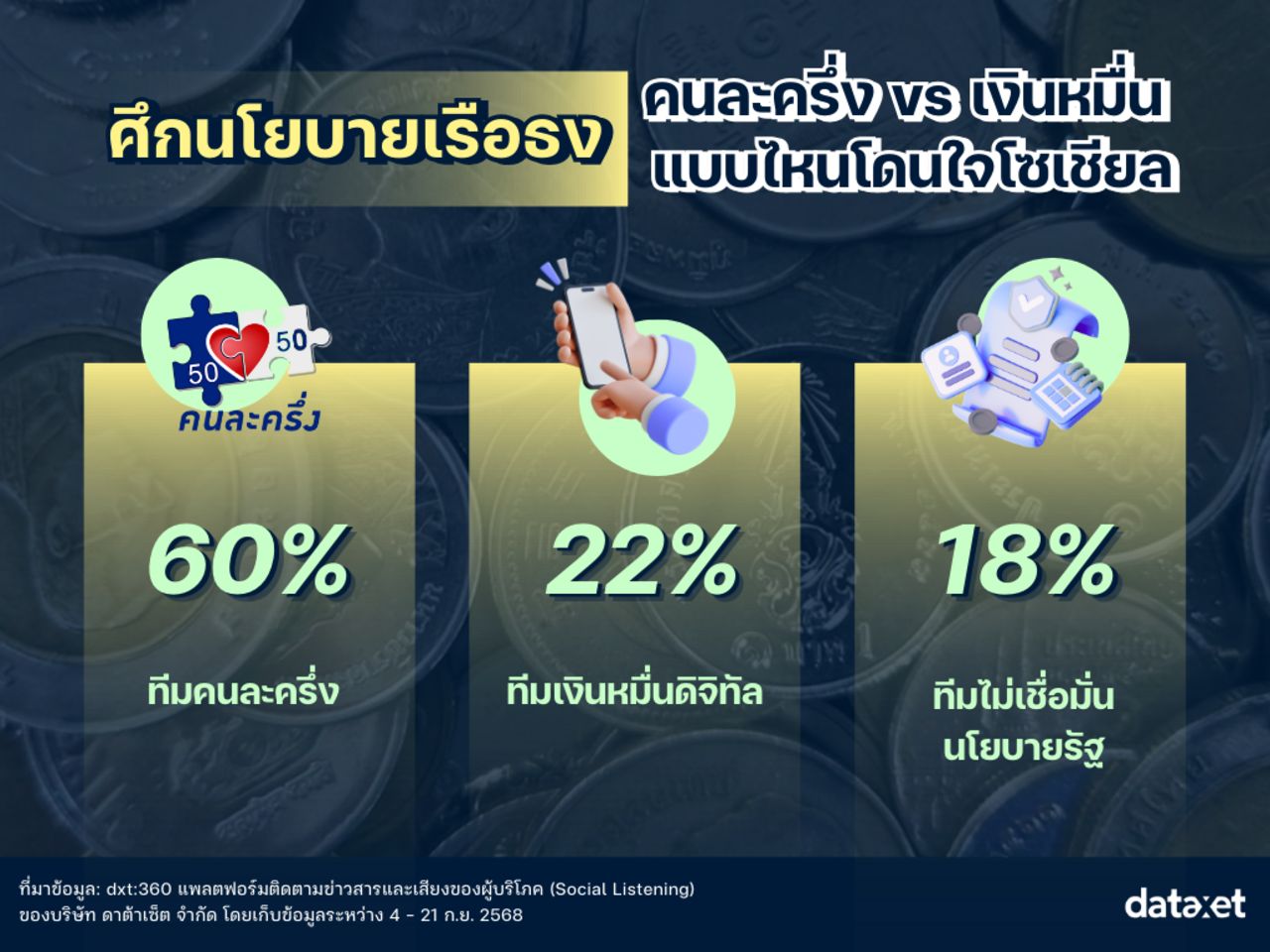 - ทีม “คนละครึ่ง” (60%): กลุ่มนี้มองว่า "คนละครึ่ง" คือนโยบายที่ จับต้องได้และเห็นผลจริง จากประสบการณ์ตรงที่เคยใช้ ช่วยลดภาระค่าครองชีพในชีวิตประจำวัน และทำให้เงินหมุนเวียนในเศรษฐกิจฐานรากอย่างแท้จริง จึงเป็นนโยบายที่น่าเชื่อถือและมีประสิทธิภาพมากกว่า