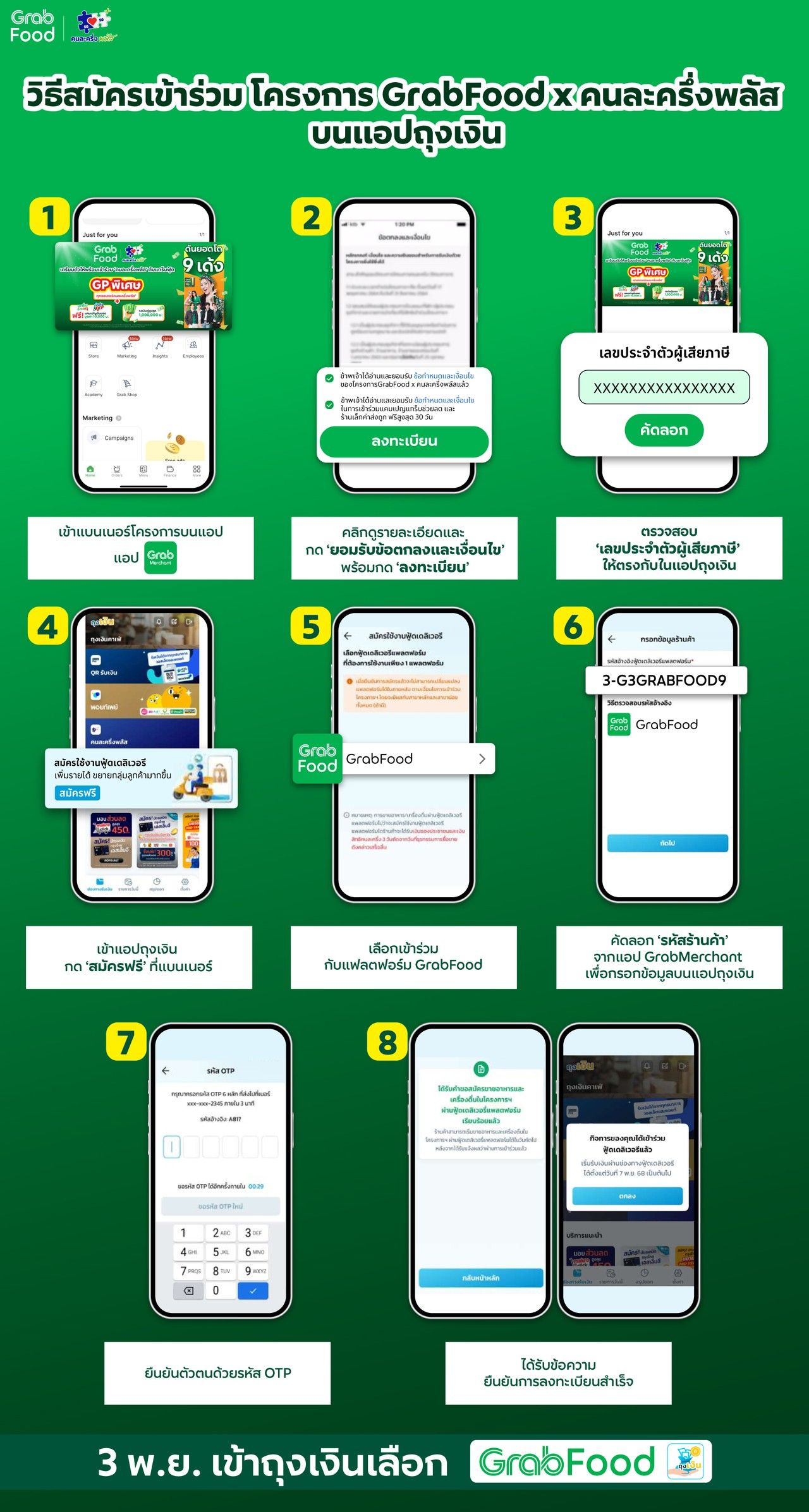 สำหรับขั้นตอนลงทะเบียนร้านค้าที่เข้าร่วมโครงการ “คนละครึ่งพลัส” กับแกร็บฟู้ด ลงทะเบียนได้ตั้งแต่วันที่ 3 พ.ย. – 31 ธ.ค. 2568 บนแอปฯ ถุงเงิน และเลือกเข้าร่วมคนละครึ่งพลัสกับแกร็บฟู้ด ตามขั้นตอนดังต่อไปนี้