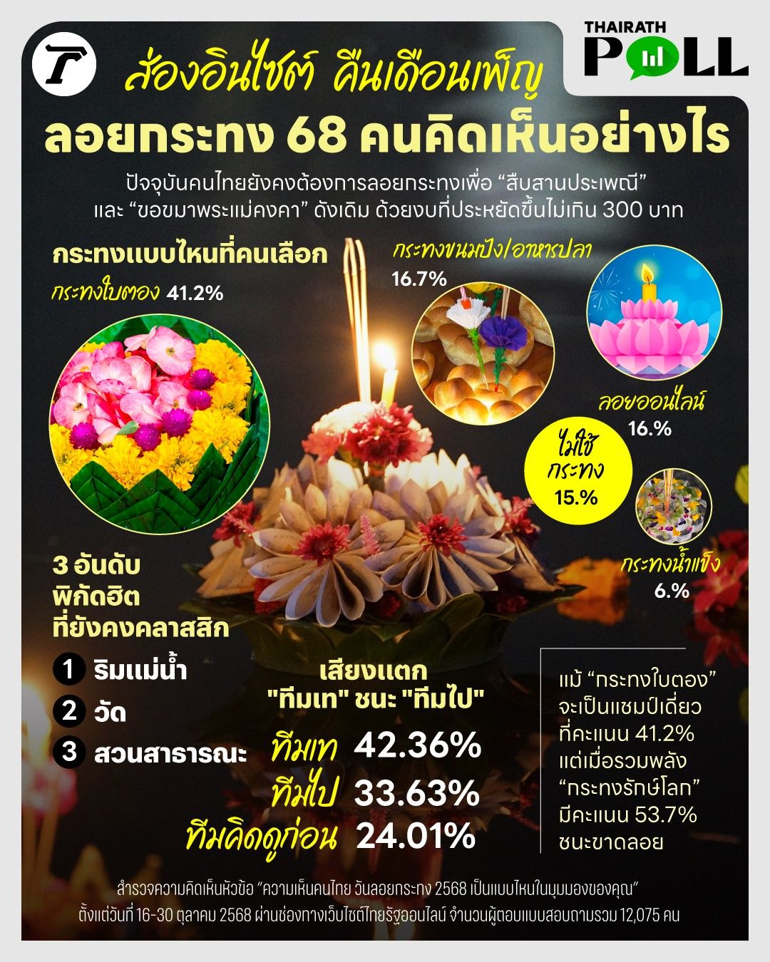 เมื่อรวมสองอันดับแรกเข้าด้วยกัน จะพบว่าคนไทยเกือบ 70% ยังคงมองว่าลอยกระทงคือเรื่องของ "วัฒนธรรม" และ "จิตวิญญาณ"นี่จึงเป็นบทสรุปของเทรนด์ลอยกระทง 2568 จากไทยรัฐโพล ที่สะท้อนว่า แม้คนกลุ่มใหญ่ที่สุดจะเลือก "ไม่ไป" แต่สำหรับคนที่ "ไป" พวกเขากำลังกลับไปสู่รากเหง้าดั้งเดิม คือการ "สืบสานประเพณีและขอขมา" เลือกใช้ "กระทงใบตอง" ในสถานที่ดั้งเดิมอย่าง "ริมน้ำและวัด" และทั้งหมดนี้เกิดขึ้นภายใต้งบประมาณที่ "ประหยัด" (ไม่เกิน 300 บาท) ตอกย้ำว่าลอยกระทงในใจคนไทย ยังคงเป็นเทศกาลที่ขลังอยู่ แต่ไม่เน้นความสิ้นเปลืองนั่นเอง