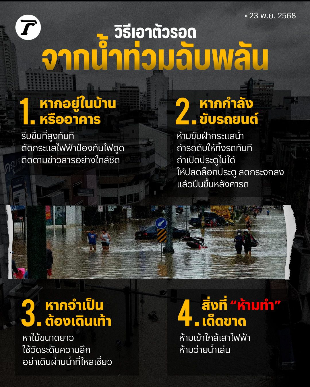 - ถ้ารถดับกลางน้ำ: ให้ทิ้งรถทันที และรีบหนีขึ้นที่สูง