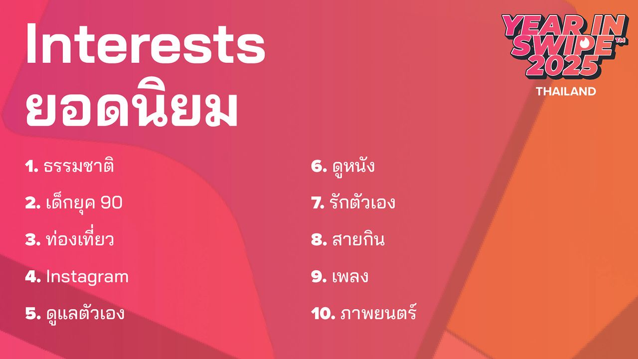 สำหรับพฤติกรรมที่น่าสนใจของคนโสดชาวไทยในปีนี้ พบว่า ธรรมชาติ ก้าวขึ้นมาเป็นหัวข้อความสนใจอันดับหนึ่งเป็นครั้งแรก แซงหน้ากิจกรรมสันทนาการอื่นๆ สะท้อนถึงไลฟ์สไตล์การเดตที่มุ่งเน้นประสบการณ์กลางแจ้ง เช่น การเดินเขา หรือการพักผ่อนในสวนสาธารณะ ขณะที่หัวข้อเรื่องอาหาร ยังคงเป็นหัวใจสำคัญในการเริ่มต้นบทสนทนา โดยมีเมนูยอดนิยมอย่าง กาแฟ, ชาเขียว, ชาบู และหมูกระทะ เป็นสื่อกลางในการนัดเดตครั้งแรก