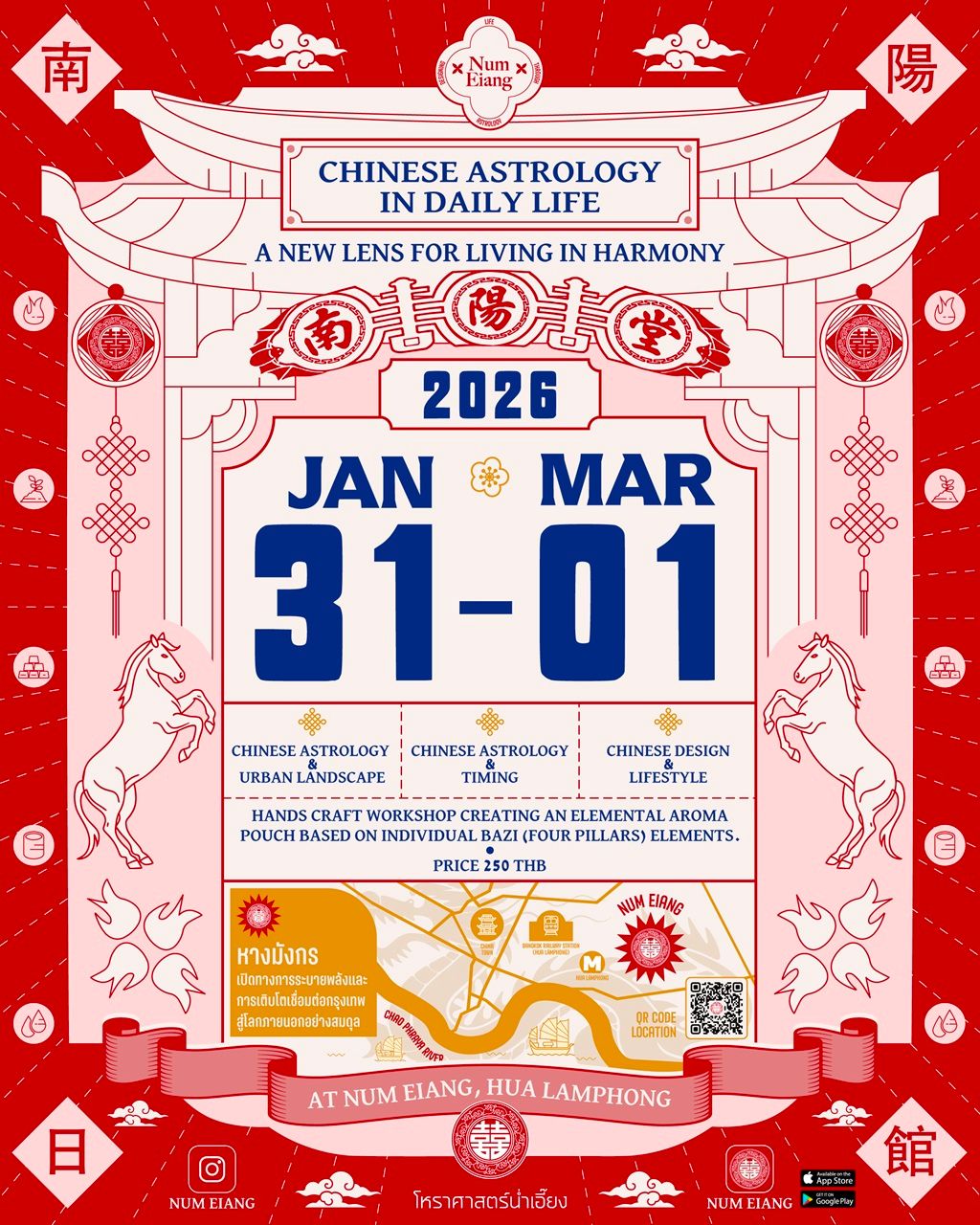 เมื่อโหราศาสตร์จีนไม่ได้มีไว้แค่ “ทำนาย” แต่กลายเป็น “ภาษาทางวัฒนธรรม” ที่เชื่อมโยงวิถีชีวิตคนเมืองเข้ากับสมดุลแห่งจักรวาล “น่ำเอี๊ยง” (NumEiang) ปฏิทินโหราศาสตร์จีนในตำนาน ชวนมาร่วมออกแบบประสบการณ์ชีวิตผ่านอีเว้นท์พิเศษ “Chinese Astrology in Daily Life” ในเทศกาลงานออกแบบกรุงเทพฯ (Bangkok Design Week 2026) ที่ย่านหัวลำโพง