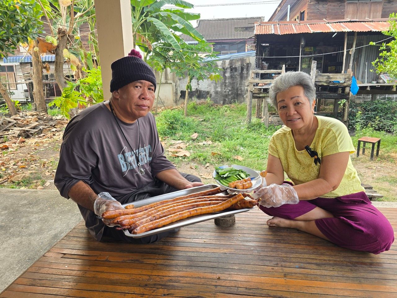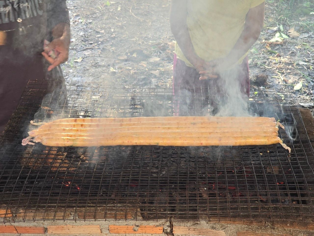 เคล็ดลับที่ทำให้ไส้กรอกถั่วของป้าเจี๊ยบ และพี่เชตรมีสีเหลืองทองและหอมเย้ายวน ไม่ได้อยู่ที่เครื่องปรุงเพียงอย่างเดียว แต่อยู่ที่กรรมวิธีการย่างที่ต้องใช้ความใจเย็นขั้นสุด ด้วยศิลปะการย่างด้วยไฟอ่อนและควันกากมะพร้าว