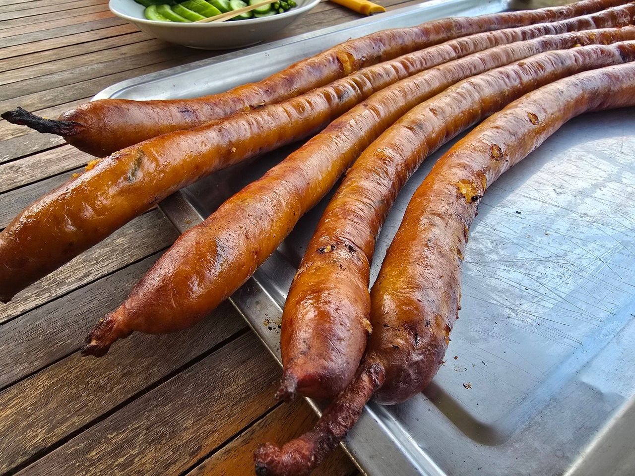 เมื่อสุกได้ที่ ไส้กรอกถั่วโบราณจะถูกนำมาหั่นเป็นชิ้นพอดีคำ เสิร์ฟคู่กับเครื่องเคียงอย่างผักสดนานาชนิด ทั้งผักชีฝรั่ง แตงกวา และพริกขี้หนูสด ช่วยตัดเลี่ยนและเสริมรสชาติให้กลมกล่อมลงตัว ถือเป็นความภาคภูมิใจของชาวนครชุมที่ยังคงรักษาอัตลักษณ์แห่งรสชาติที่แท้จริงของบ้านเกิดเอาไว้ได้อย่างสมบูรณ์แบบ