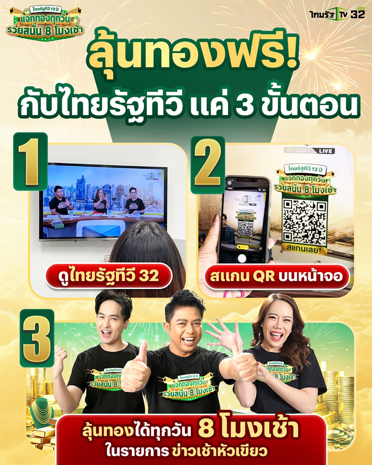 ไทยรัฐแจกทอง กลับมาแล้ว ฉลองก้าวเข้าสู่ปีที่ 12 ไทยรัฐทีวี ส่งแคมเปญ “ไทยรัฐทีวี 12 ปี รวยสนั่น 8 โมงเช้า” คืนกำไรให้ผู้ชมทั่วประเทศ ชวนร่วมลุ้นรับโชคทองตลอดทั้งวัน เพียงสแกน QR Code บนหน้าจอไทยรัฐทีวี ยิ่งดู ยิ่งสแกน ยิ่งมีสิทธิ์มาก เริ่มตั้งแต่วันที่ 16 มีนาคม 2569 เป็นต้นไป