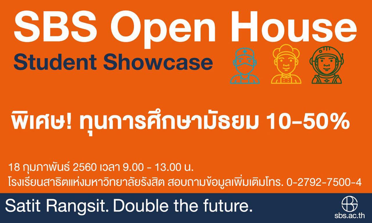 โรงเรียนสาธิตแห่งมหาวิทยาลัยรังสิต จัดกิจกรรม SBS Open House : Student Showcase 2017 เชิญชวนคุณพ่อคุณแม่และผู้ที่สนใจเยี่ยมชมโรงเรียนและการนำเสนอผลงานนักเรียนทุกระดับชั้น มารู้จักกับหลักสูตรทวิภาษามาตรฐานนานาชาติที่บ่มเพาะนักเรียนให้มีความเป็นผู้นำสากลในศตวรรษที่ 21 เน้นวิธีการคิดวิเคราะห์ แก้ปัญหา การแสวงหาความรู้ด้วยตนเอง เพื่อการเป็นผู้นำที่ดีในอนาคต ในวันเสาร์ที่ 18 กุมภาพันธ์ 2560 เวลา 09.00-13.00 น. นอกจากนี้ ภายในงานยังเปิดรับสมัครนักเรียนใหม่ โดยมอบทุนการศึกษาระดับมัธยมศึกษา 10-50% สำหรับนักเรียนที่ผ่านเกณฑ์ และรับสิทธิ์เรียนซัมเมอร์เมื่อสมัครเรียนอีกด้วย สำหรับผู้ที่สนใจร่วมกิจกรรมสอบถามข้อมูลเพิ่มเติมโทร. 0-2792-7500-4 ลงทะเบียนออนไลน์ ได้ที่ www.sbs.ac.th