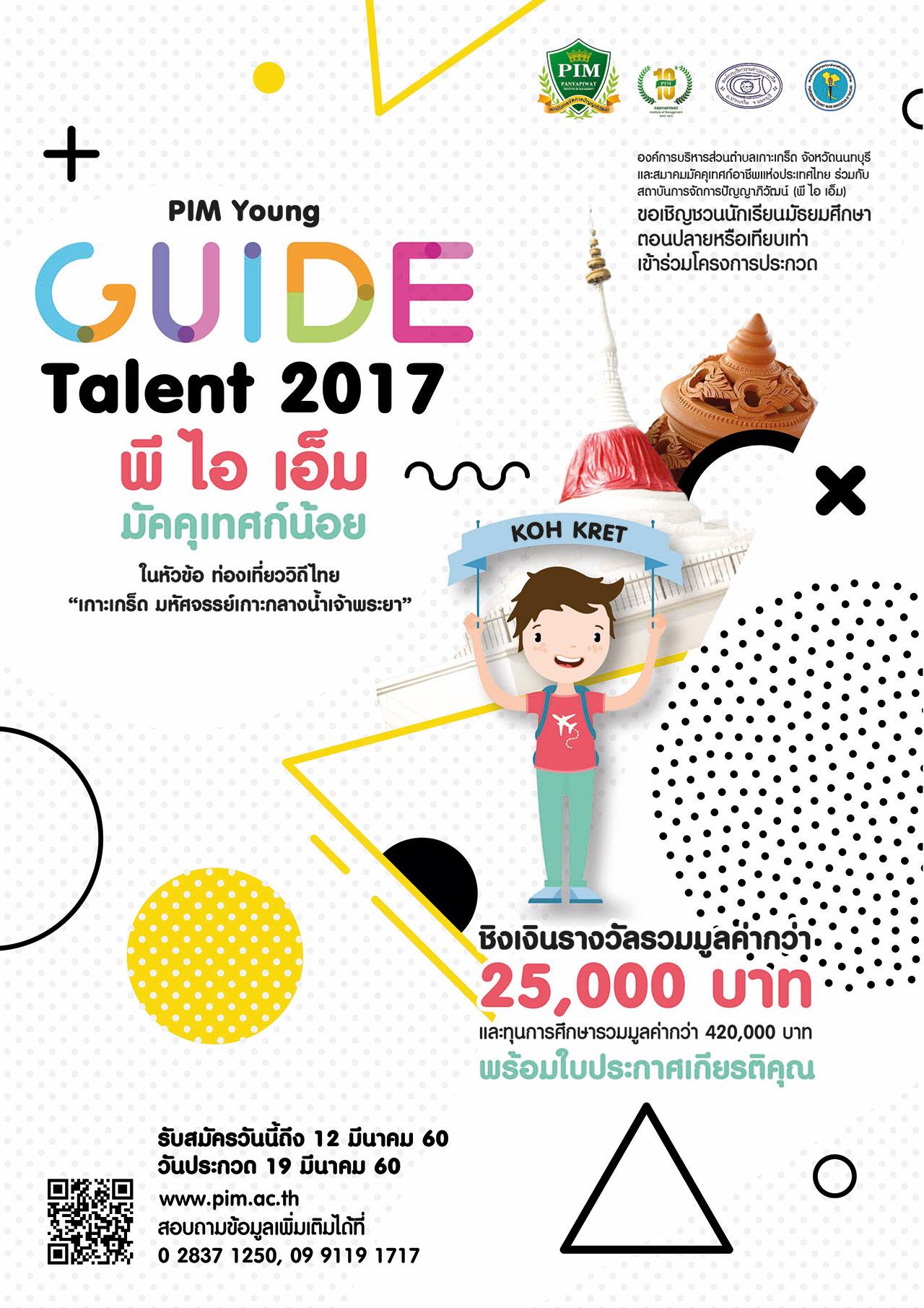 พีไอเอ็ม ขอเชิญน้องนักเรียนมัธยมศึกษาตอนปลายหรือเทียบเท่า เข้าร่วมการประกวด “PIM Young Guide Talent 2017” (พี ไอ เอ็ม มัคคุเทศก์น้อย) ในหัวข้อ “ท่องเที่ยววิถีไทย เกาะเกร็ด มหัศจรรย์ เกาะกลางน้ำเจ้าพระยา” ชิงเงินรางวัลมูลค่ากว่า 25,000 บาท และทุนการศึกษามูลค่าร่วมกว่า 420,000 บาท พร้อมใบประกาศเกียรติคุณ ในวันอาทิตย์ที่ 19 มีนาคม 2560 เวลา 07.00–16.00 ณ วัดปรมัยยิกาวาส ตำบลเกาะเกร็ด จังหวัดนนทบุรี สามารถสอบถามข้อมูลเพิ่มเติมได้ที่ โทร. 02-837-1250, 099-117-1717