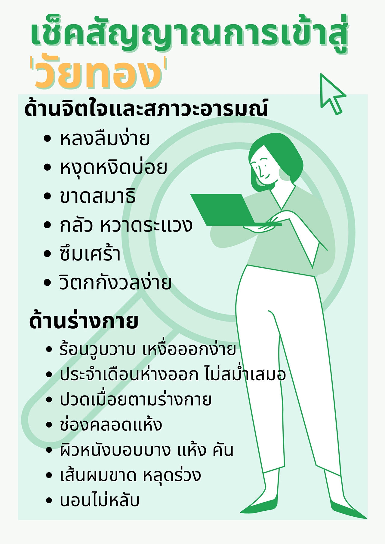 ความเปลี่ยนแปลงทางด้านร่างกายเป็นสัญญาณแรกที่ผู้หญิงแทบทุกคนจะสังเกตเห็นได้ด้วยตนเอง เมื่ออายุมาที่ 40 ปี จะสังเกตว่าตัวเองจะเริ่มเข้าสู่ภาวะหมดระดู หรือ Menopause ได้โดยสังเกตจากประจำเดือนจะเริ่มห่างออกหรือขาดเป็นเวลาหลายเดือน ถ้าขาดประจำเดือนติดต่อกันเป็นเวลา 12 เดือน ถือว่าผู้หญิงคนนั้นเข้าสู่วัยทองเต็มตัว อาจมีอาการวัยทองร่วมด้วย เช่น ความรู้สึกร้อนวูบวาบ เหงื่อออกมาก จนถึงความรู้สึกไม่แจ่มใส และการไม่สามารถควบคุมอารมณ์ขึ้นลงของตัวเองได้ เป็นต้น