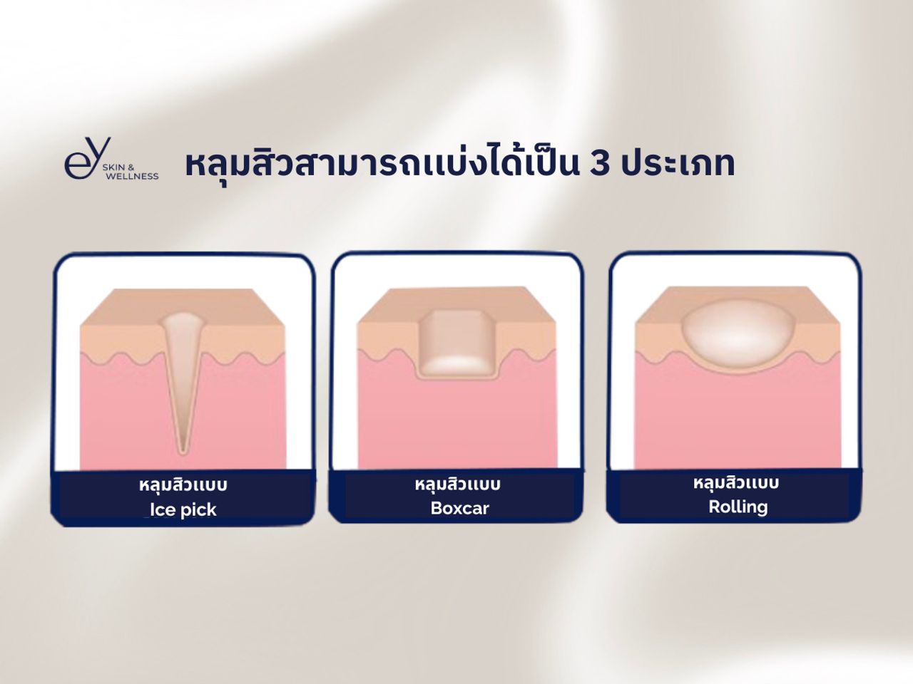 เมื่อเรารักษาและป้องกันสิวจากต้นเหตุได้แล้ว อีกหนึ่งปัญหาที่ตามมาสำหรับสิววัยผู้ใหญ่คือ “หลุมสิว” ที่มักจะทิ้งร่องรอยสมรภูมิไว้ให้เราดูต่างหน้าแม้จะไม่อยากได้ก็ตาม ซึ่งหลุมสิวก็มีหลายประเภทที่มีการดูแลรักษาต่างกัน ผู้ที่มีปัญหาหลุมสิวควรต้องรู้เพื่อประโยชน์ของการเข้ารักษาอย่างถูกวิธี ว่าตนเองเป็นสิวประเภทไหนและควรเข้ารักษาด้วยวิธีใดจึงจะมีประสิทธิภาพมากที่สุด แพทย์หญิงพัจนภา เวชอนุรักษ์ (หมอผึ้ง) แพทย์เฉพาะทางด้านผิวหนัง (Board-Certified Dermatologist) EY CLINIC กล่าวว่า หลุมสิวแบ่งออกเป็น 3 รูปแบบ ตามลักษณะการเกิด คือ