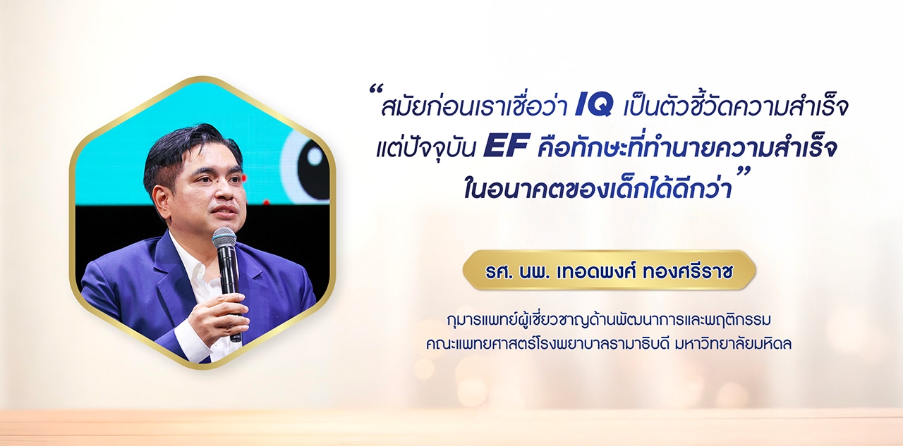 "สมัยก่อนเราเชื่อว่า IQ เป็นตัวชี้วัดความสำเร็จ แต่ปัจจุบัน EF คือทักษะที่ทำนายความสำเร็จในอนาคตของเด็กได้ดีกว่า เพราะเด็กจะสามารถควบคุมตัวเองได้ แก้ไขปัญหาเฉพาะหน้าได้ ปรับตัวได้ และรู้จักหน้าที่ของตัวเอง"