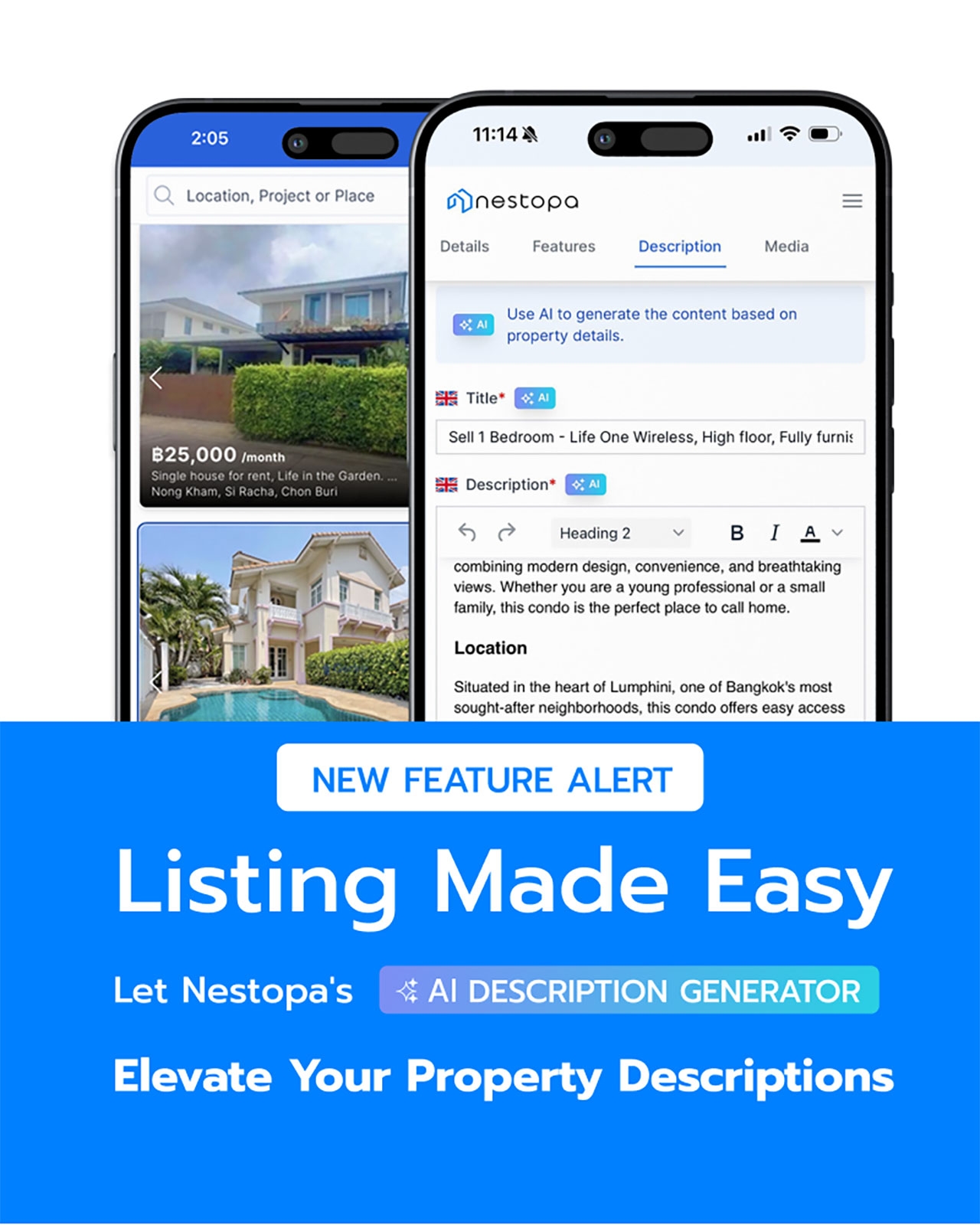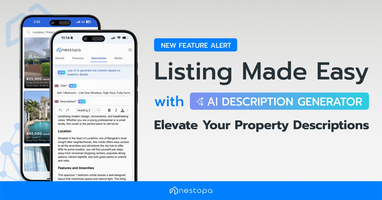 นอกจากนี้ Nestopa ยังเป็นเว็บไซต์อสังหาริมทรัพย์แห่งแรกในประเทศไทยที่มีฟีเจอร์ AI Description Generator เครื่องมือค้นหาขั้นสูงที่ให้คุณค้นหาบ้านตามความต้องการเฉพาะของคุณ เช่น ขนาด ราคา ที่ตั้ง และประเภท ทำให้คุณพบบ้านที่ตรงใจคุณได้ง่ายขึ้น พร้อมฟีเจอร์การแจ้งเตือนที่จะช่วยให้คุณรู้เมื่อมีบ้านที่ตรงตามความต้องการของคุณลงประกาศ ทำให้คุณไม่พลาดโอกาสในการเป็นเจ้าของบ้านในฝัน