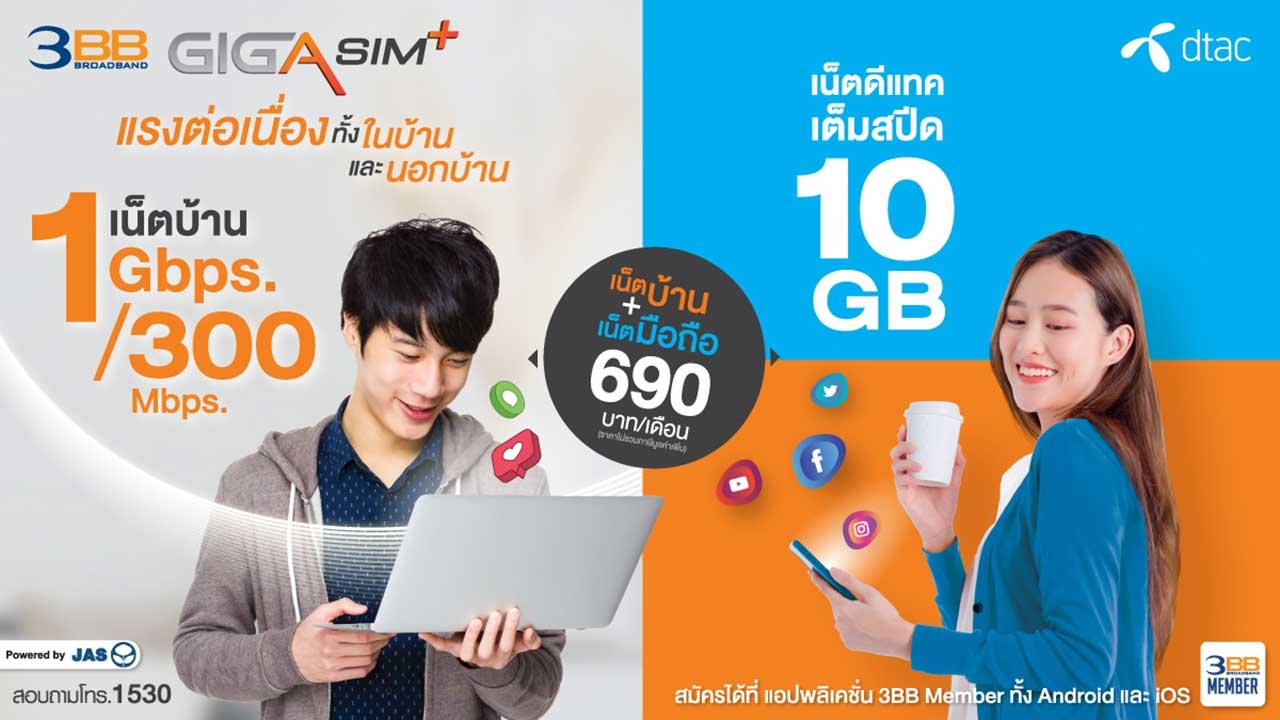 หลังจาก 3BB และ DTAC ได้จับมือร่วมเป็น Strategic Partner มาตั้งแต่ปลายปี 2562 เป็นต้นมา ได้ออกแพ็กเกจใหม่เพื่อตอบโจทย์ลูกค้า ที่ต้องการใช้เน็ตบ้านความเร็วระดับ 1 Gbps. ในขณะเดียวกันเมื่อออกนอกบ้านก็ต้องการเน็ตแรงแบบต่อเนื่อง ไม่มีสะดุดเช่นเดียวกัน แพ็กเกจ “GIGASim+” จึงเป็นคำตอบสำหรับการใช้งานในลักษณะดังกล่าวได้เป็นอย่างดี