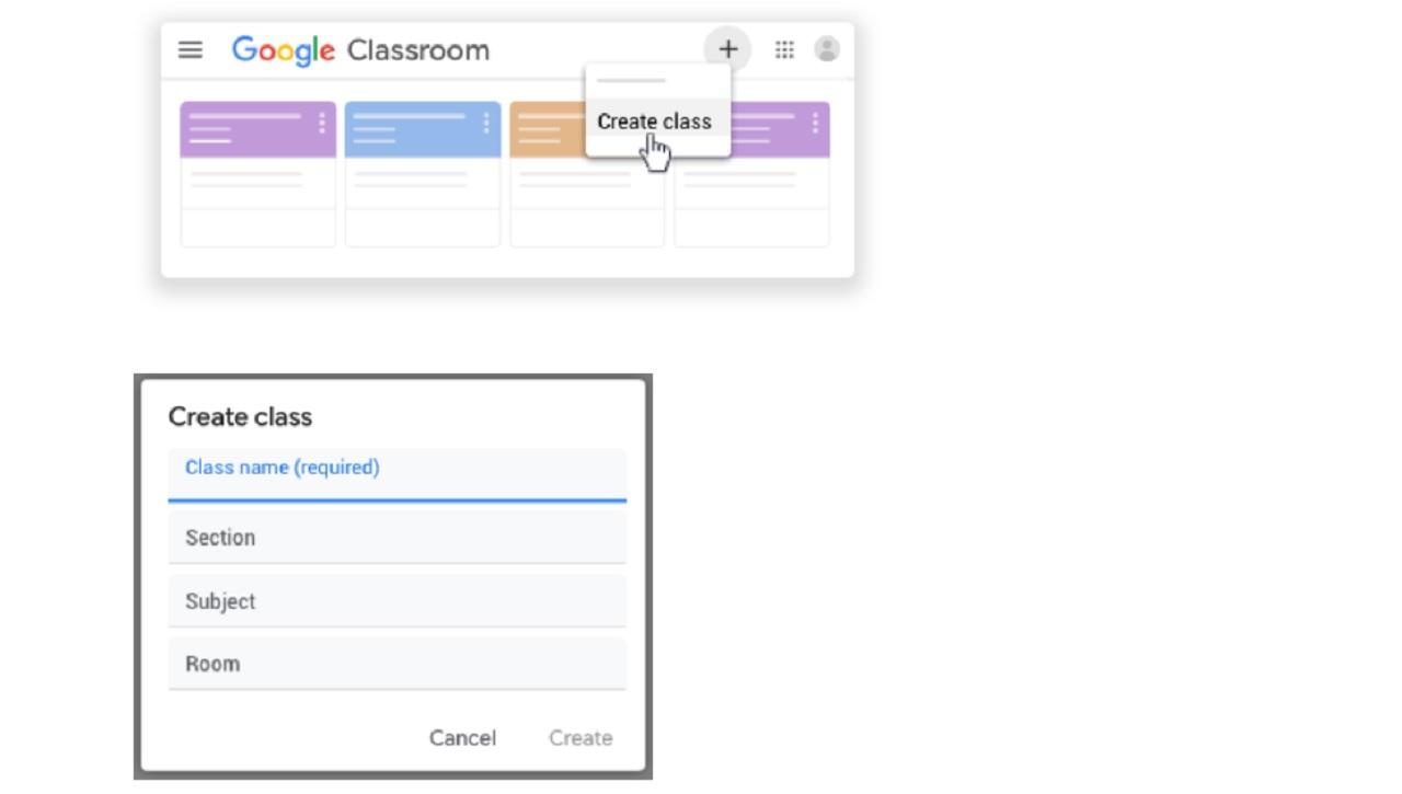 ในสถาบันการเรียน จะต้องมีผู้สอนเข้าไปเลือกสร้างชั้นเรียนไว้ก่อน แล้วค่อยเพิ่มจำนวนผู้สอน และเพิ่มผู้เรียนภายหลังด้วยการกดเครื่องหมายบวก ในห้อง Google Classroom > Create Class และกรอกข้อมูลชื่อชั้นเรียน, เวลาเรียน, วิชา แล้วกด Create