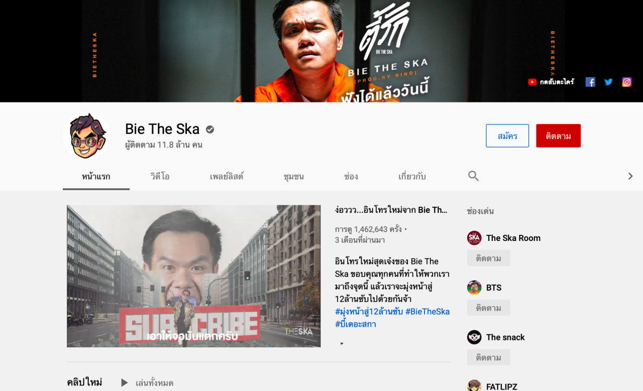 เริ่มจากช่อง Bie The Ska มียอด Subscriber 11.8 ล้านคน โดย กฤษณ์ บุญญะรัง อายุ 31 ปี หรือที่รู้จักในชื่อ บี้ เดอะสกา ทำคลิปวิดีโออัปโหลดลง YouTube มาตั้งแต่ปี 2011 จนปัจจุบันมีคลิปใ่นช่องมากกว่า 1,000 คลิป และมีผลงานทำเพลงร่วมกับดาราดังๆ และได้จดทะเบียนบริษัทในชื่อ บริษัท เดอะสกาฟิล์ม จำกัด สำหรับจัดทำสื่อวิดีโอครบวงจร พร้อมรับสปอนเซอร์หรืองานรีวิวต่างๆ รวมถึงทำรายการออนไลน์ หนังสั้น ภาพยนตร์ ได้เต็มรูปแบบ