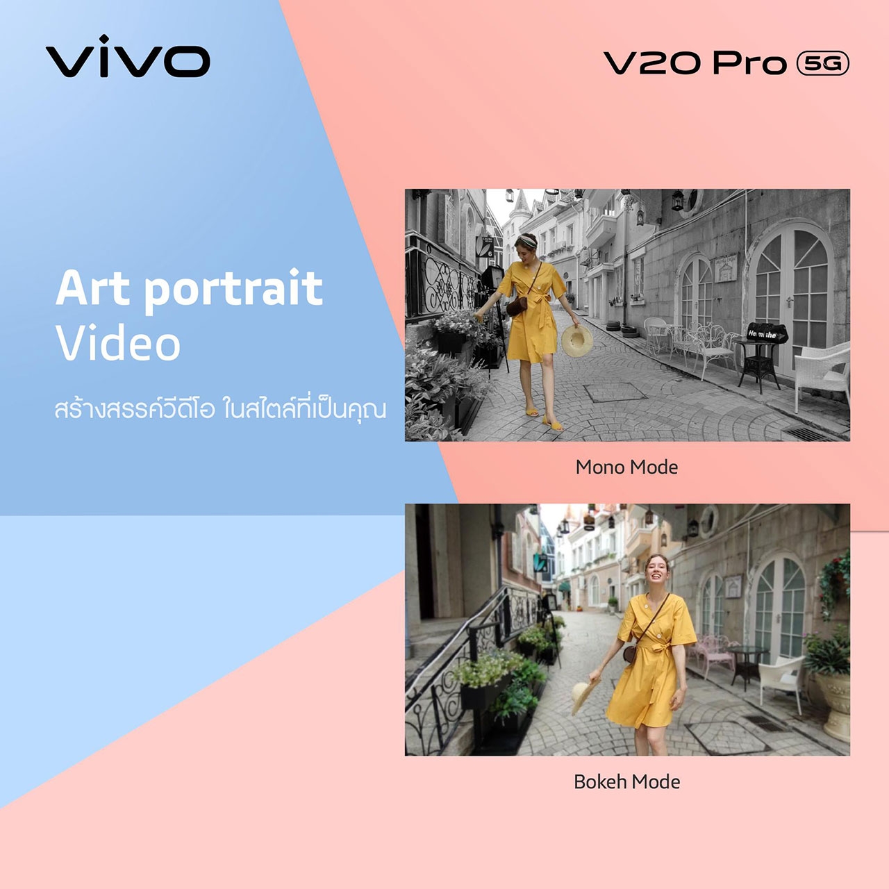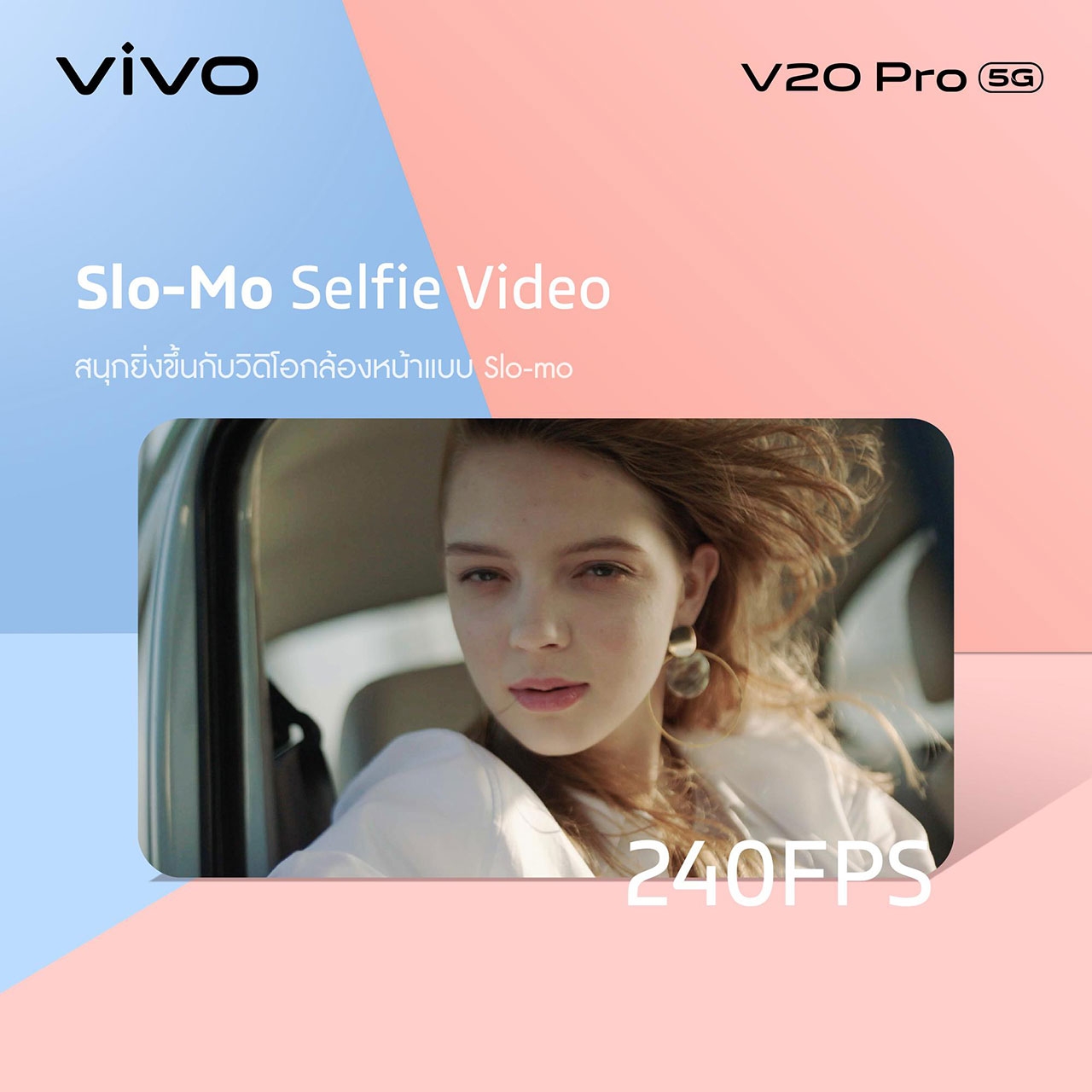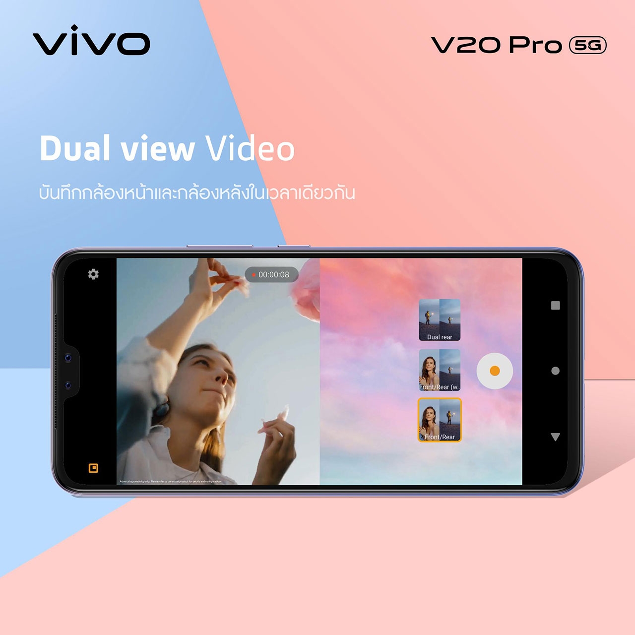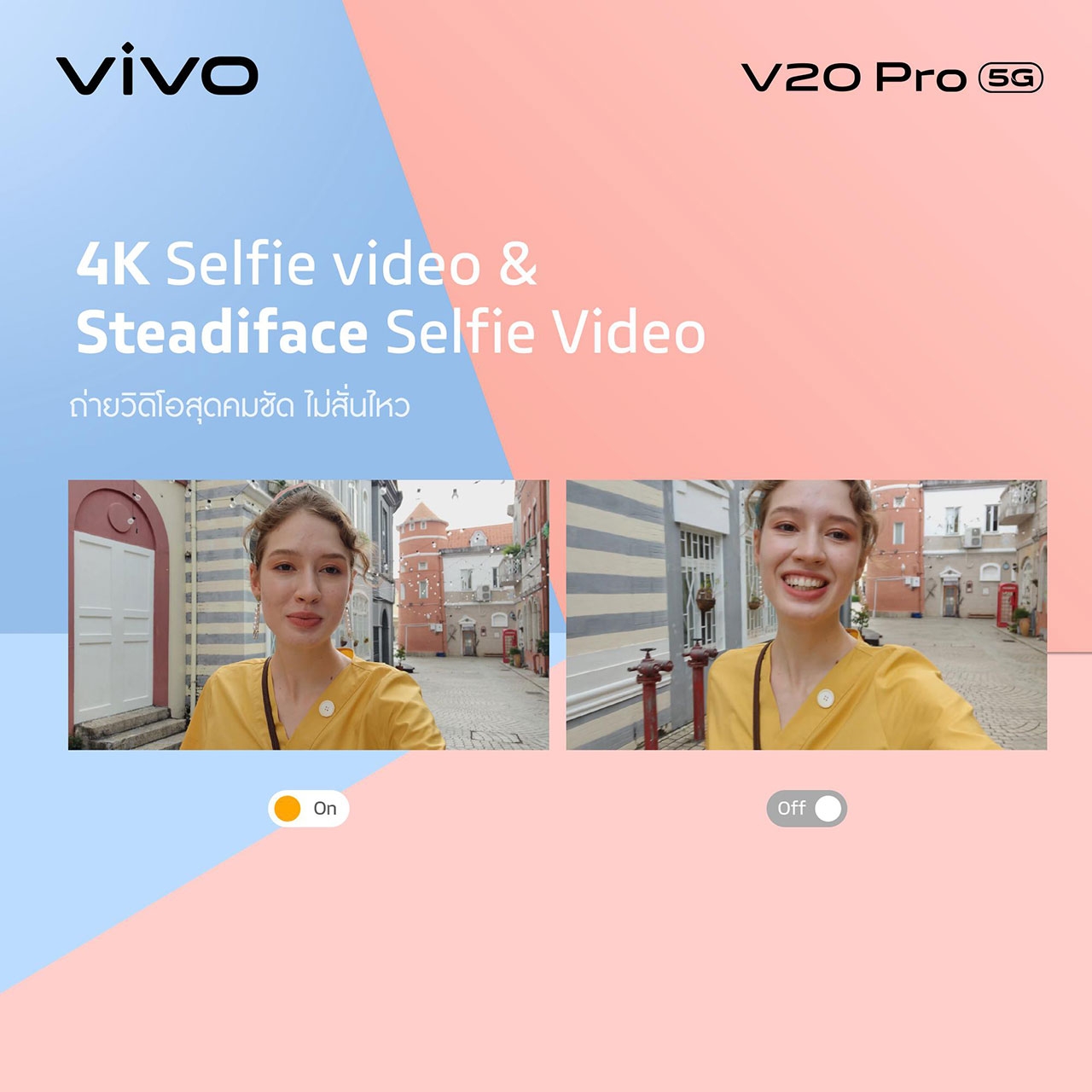และเพื่อตอบรับเทรนด์ของ Vlogger ที่กำลังให้ความสนใจกับการผลิตวิดีโอจากกล้องหน้ากันมากขึ้น Vivo V20 Pro 5G ยังมาพร้อมความสามารถในการบันทึกวิดีโอกล้องหน้าแบบ 4K Selfie Video ให้ความคมชัดในทุกรายละเอียด และมีเสถียรภาพด้วยระบบป้องกันการสั่นไหวที่พัฒนามาเป็นอย่างดี ให้สามารถถ่ายวิดีโออย่างราบลื่นไม่ว่าจะเดินหรือวิ่ง และยังสะท้อนความงามของตัวคุณได้สมบูรณ์แบบด้วยโหมด Face Beauty และกิมมิคเก๋ๆ ที่จะช่วยให้วิดีโอของคุณมีความโดดเด่นเหนือใครด้วยฟังก์ชันพิเศษอีกมากมาย ทั้งการถ่ายวิดีโอแบบ Slo-mo Selfie ที่สลับโหมดช้าเร็วได้ง่ายเพียงปลายนิ้วและยังราบลื่นด้วย 240FPS รวมไปถึงการถ่ายวิดีโอแบบ Dual View ที่สามารถถ่ายพร้อมกันได้ทั้งกล้องหน้าและหลัง ช่วยเปิดจินตนาการในการสร้างสรรค์ และเก็บความประทับใจได้ครบทุกมุมมอง