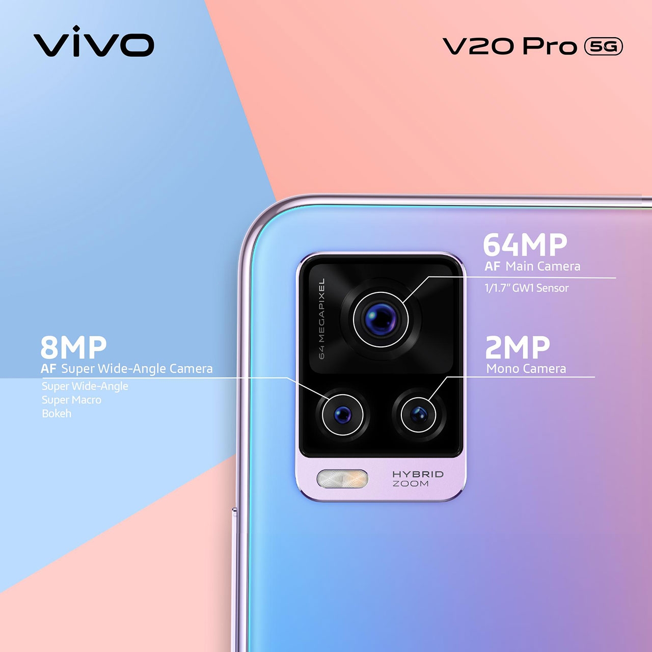 ไม่เพียงความโดดเด่นของกล้องหน้าเท่านั้น แต่ Vivo V20 Pro 5G ก็ยังมอบความคุ้มค่าให้คุณแบบไม่มีกั๊กด้วยกล้องหลังที่จัดเต็มไม่แพ้กัน ประกอบด้วยเลนส์หลัก 64MP + เลนส์ Wide-Angle/Macro/Bokeh 8MP AF + เลนส์ Mono 2MP ที่จะทำงานร่วมกันเพื่อมอบประสบการณ์ถ่ายภาพที่สมบูรณ์แบบ ทั้งความสามารถในการซูมภาพโดยยังคงความละเอียด, การถ่ายมุมกว้างได้มากถึง 120° ด้วยเลนส์ Wide Angle, การถ่าย Macro ที่ระยะโฟกัสได้ใกล้ถึง 2.5 ซม., การถ่ายภาพบุคคลเอฟเฟกต์ Bokeh ที่สวยงามและเลือกรูปแบบได้มากมายด้วย Light Speckle Bokeh รวมไปถึงเลนส์ Mono สำหรับเพิ่มประสิทธิภาพในการถ่ายภาพขาวดำโดยเฉพาะ