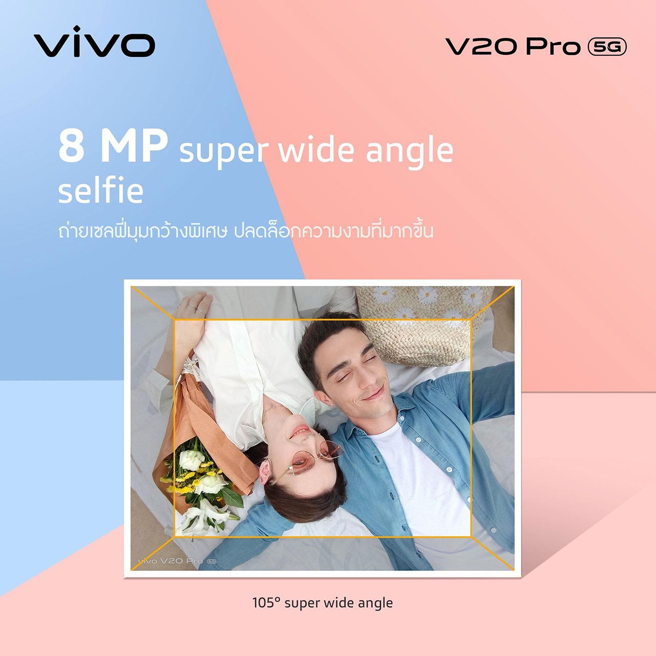และแน่นอนว่าด้วยการมีกล้องหน้าเป็นไฮไลต์สำคัญ Vivo V20 Pro 5G จึงมาพร้อมกับฟังก์ชันสนับสนุนกล้องหน้าที่จะช่วยให้การเซลฟี่เป๊ะปังโดนใจยิ่งกว่าที่เคยอีกจำนวนมาก ไล่เรียงมาตั้งแต่การทำลายข้อจำกัดเรื่องมุมมอง ด้วยเลนส์กล้องหน้า Super Wide-Angle 8 MP 105° ให้คุณมั่นใจได้ว่าจะเก็บทุกความประทับใจได้ครบถ้วนไม่มีใครหลุดออกจากเฟรม อีกทั้งยังสามารถเก็บบรรยากาศโดยรอบได้เต็มความรู้สึกยิ่งกว่าเคยโดยไม่ต้องกังวลว่าภาพจะบิดเบี้ยว เพราะ AI ของ Vivo นั้นจะช่วยปรับภาพให้ออกมาสมบูรณ์แบบที่สุดในทุกมุมมอง