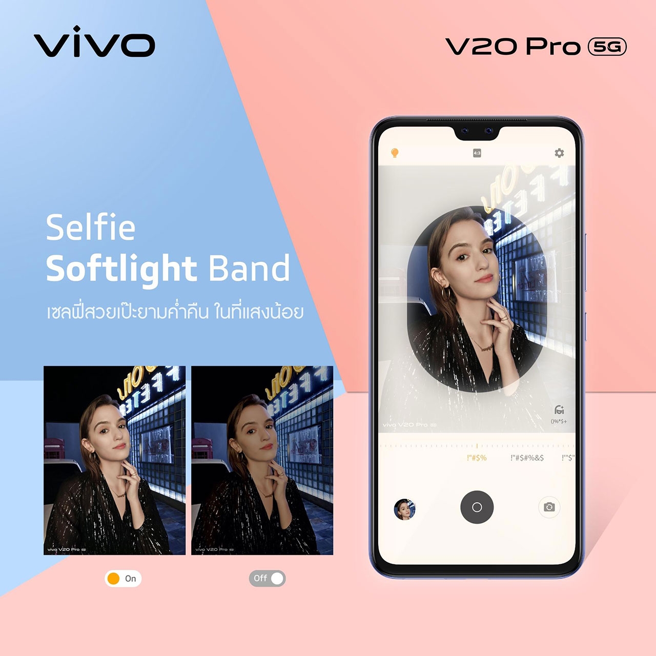 โดยนอกเหนือจากเลนส์มุมกว้าง Vivo V20 Pro 5Gก็ยังมีระบบ AI Low-Light Portrait ที่จะช่วยปรับแสงสว่างให้กับใบหน้าของคุณ และทำงานควบคู่ไปกับโหมด Selfie Softlight Band ที่ถูกพัฒนาขึ้นเพื่อให้ถ่ายเซลฟี่กลางคืนได้อย่างสวยคมชัด ให้อุณหภูมิสีที่สมบูรณ์แบบ และโทนสีผิวที่เป็นธรรมชาติมากขึ้นปรับตามแสงโดยรอบโดยอัตโนมัติ ให้คุณมั่นใจในการเซลฟี่ไม่ว่าจะกลางวันหรือกลางคืน