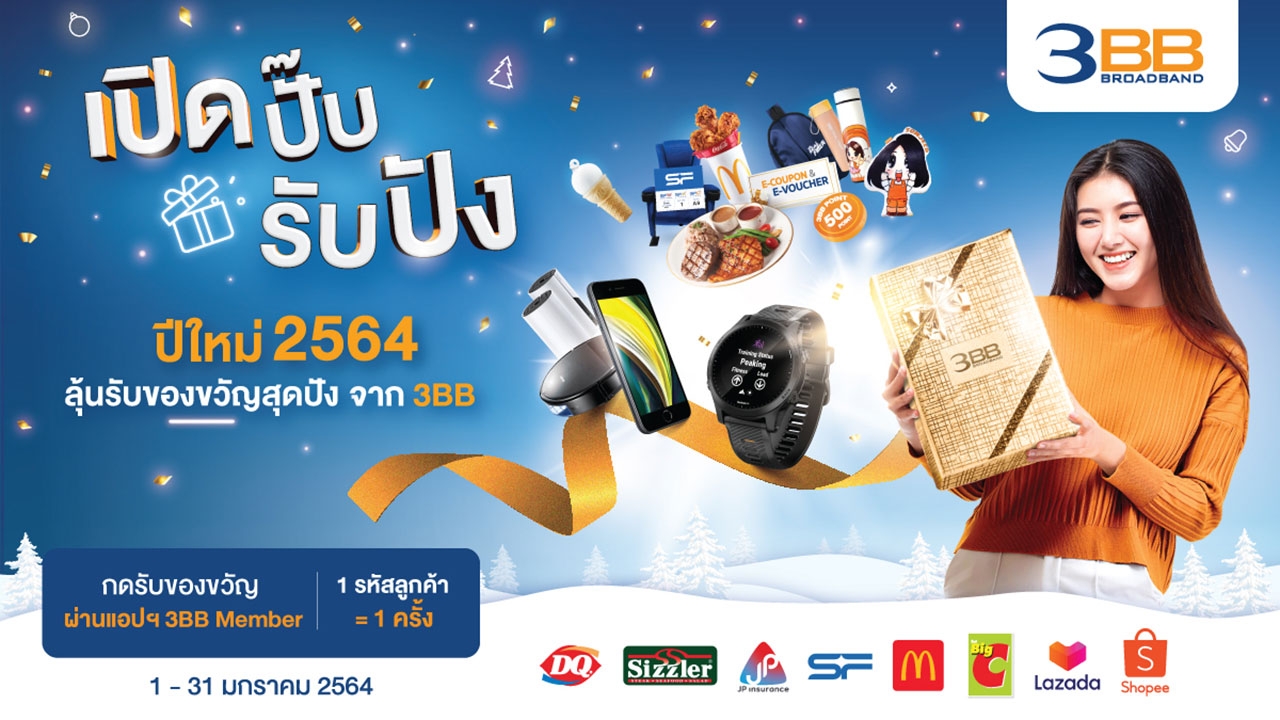 3BB ร่วมฉลองเทศกาลปีใหม่ จัดของขวัญจากใจส่งมอบเป็นความสุขให้กับลูกค้ากว่า 1.5 แสนชิ้น รวมมูลค่ากว่า 10 ล้านบาท ลูกค้า 3BB Member เตรียมตัวกดรับของขวัญปีใหม่ได้ฟรี!! ที่แอป 3BB Member เริ่มวันที่ 1 มกราคม 64 เป็นต้นไป