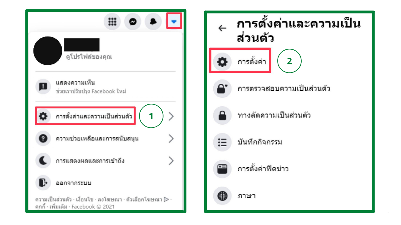1. ล็อกอินเข้าบัญชี Facebook ให้เรียบร้อย > คลิกสามเหลี่ยมเล็กๆ ที่มุมขวาของหน้าจอ > เลือกการตั้งค่าและความเป็นส่วนตัว