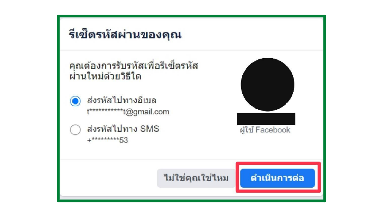 2. ระบบจะปรากฏหน้ารีเซตรหัสผ่านของคุณ โดยจะส่งลิงก์ที่สามารถตั้งค่ารหัสผ่านใหม่ได้ ไปทาง 2 ช่องทาง ได้แก่ อีเมล และหมายเลขโทรศัพท์ เมื่อเลือกแล้วให้คลิกดำเนินการต่อได้เลย หลังจากนั้นจึงจะสามารถตั้งรหัสผ่านใหม่ได้ตามปกติ