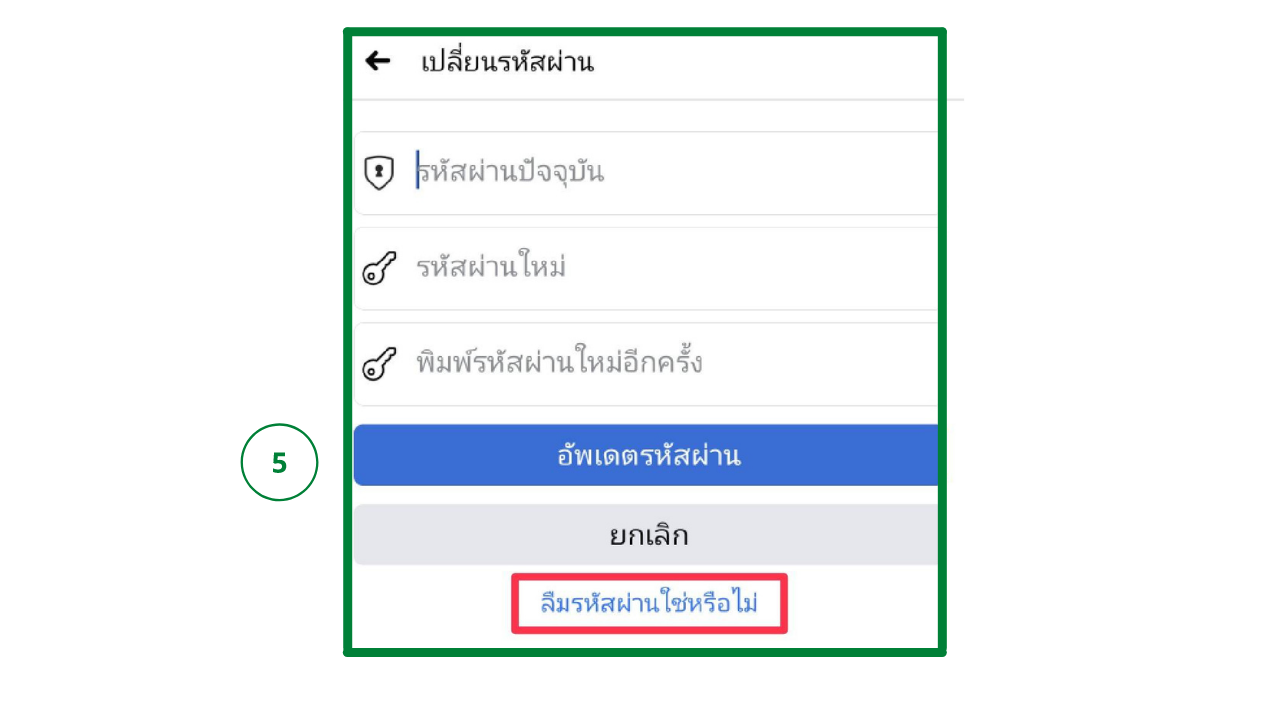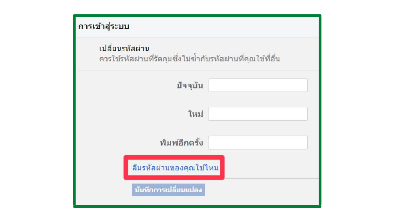ในกรณีที่ลืมรหัสผ่าน ให้เลือกเมนูลืมรหัสผ่านใช่หรือไม่ เพื่อยืนยันตัวตนผ่านช่องทางต่างๆ และรับลิงก์สำหรับตั้งรหัสผ่านใหม่ หลังจากนั้นให้ลองออกจากระบบ และล็อกอินเข้าสู่ Facebook อีกครั้งด้วยรหัสผ่านใหม่