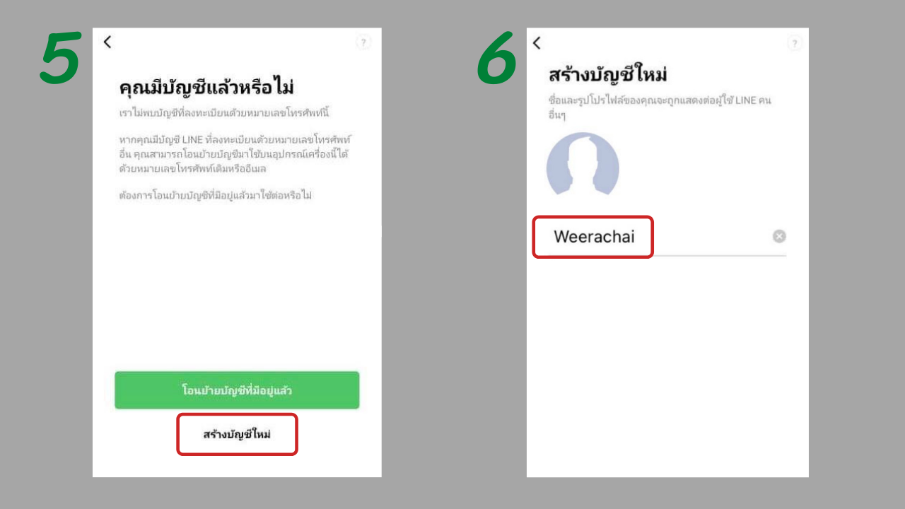 5. บางคนอาจเคยใช้เบอร์โทรศัพท์สมัครไว้ก่อนแล้ว แต่หากต้องการเปลี่ยนไอดีไลน์ต้องเลือก "สร้างบัญชีใหม่"
