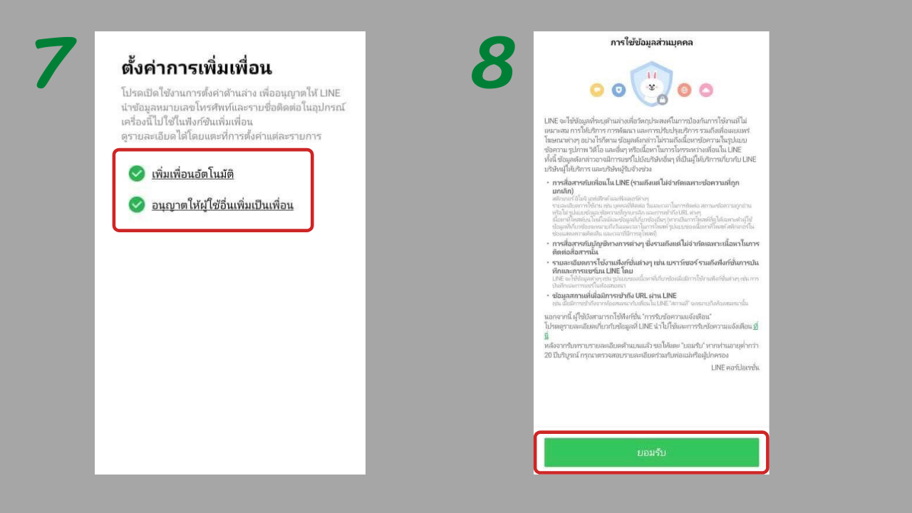 7. ตั้งค่าการเพิ่มเพื่อน หากเลือกเพิ่มเพื่อนอัตโนมัติ ไลน์จะดึงรายชื่อเพื่อนๆ ที่เรามีในสมุดโทรศัพท์ หรือหมายเลขอื่นๆ ที่อาจเคยมีประวัติโทรเข้า-ออก มาให้โดยอัตโนมัติ แต่หากเลือกอนุญาตให้ผู้ใช้อื่นเพิ่มเป็นเพื่อน คนอื่นจะแอดไลน์เราได้ก็ต่อเมื่อมีหมายเลขโทรศัพท์, ไอดีไลน์ หรือคิวอาร์โค้ด