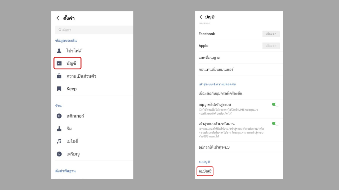 แต่หากต้องการเปลี่ยนไอดีไลน์จริงๆ จำเป็นต้องลบบัญชีที่กำลังใช้งานอยู่ แล้วสร้างบัญชีไลน์ใหม่ขึ้นมาแทน หลังจากนั้นจึงเข้าไปตั้งชื่อไอดีไลน์ที่ต้องการอีกครั้ง โดยมีขั้นตอนการลบบัญชีไลน์ดังนี้ ไปที่แถบตั้งค่า (ไอคอนรูปเกียร์) > บัญชี > ลบบัญชี > กดยืนยันลบบัญชี