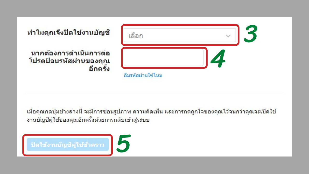 อย่างไรก็ตาม การปิดไอจีชั่วคราวเป็นเพียงการปิดใช้งานบัญชีเท่านั้น แต่หากไม่ต้องการเล่นไอจีอีกต่อไปแล้ว หรือต้องการลบบัญชีทิ้งไปเลย จะต้องเลือกแถบคำสั่ง "ลบไอจีแบบถาวร" อ่านเพิ่มเติมได้ที่ How-to แนะนำวิธีลบบัญชีไอจีถาวรทำอย่างไร?
