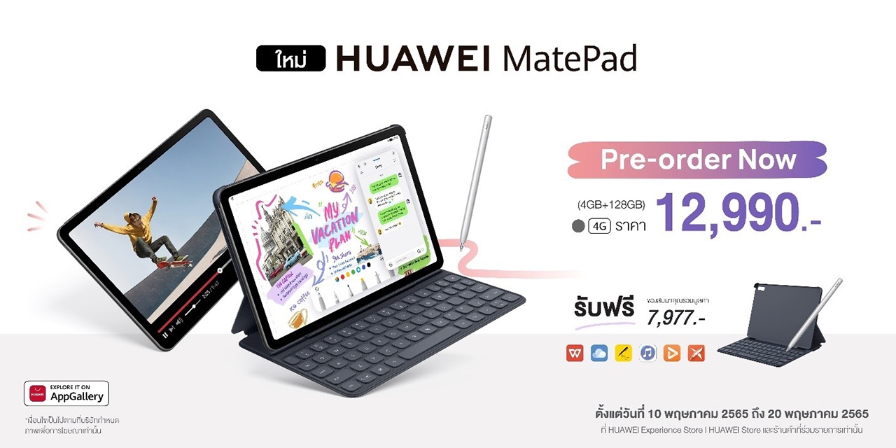HUAWEI MatePad 10.4-inch 2022 ครบครันทั้งซอฟต์แวร์ ฮาร์ดแวร์ และอุปกรณ์เสริมแบบจัดเต็มรอบด้าน ตอบโจทย์การทำงานและความบันเทิงได้ทุกที่ทุกเวลาแบบไม่ยุ่งยาก หากใครที่กำลังอยากได้อุปกรณ์ไอทีสารพัดประโยชน์แบบพกพาง่ายและหยิบมาใช้งานได้สะดวกอาจจะต้องจัดมาติดตัวไว้สักเครื่อง โดย HUAWEI MatePad 10.4-inch 2022 (4GB+128GB) 4G มาในสี Matte Grey ราคา 12,990 บาท สามารถพรีออเดอร์ได้ตั้งแต่วันที่ 10 พฤษภาคม 2565 – 20 พฤษภาคม 2565 พร้อมรับฟรี HUAWEI Smart Keyboard (มูลค่า 2,290 บาท) และ HUAWEI M-Pencil Package 2nd generation (มูลค่า 4,490 บาท) และสิทธิประโยชน์อีกมากมาย สำหรับลูกค้า HUAWEI Mobile Service และแอปพลิเคชันต่างๆ (มูลค่ารวม 1,197 บาท) รวมมูลค่าทั้งหมด 7,977 บาท เป็นเจ้าของได้ง่ายนิดเดียวผ่าน HUAWEI Experience Store และร้านค้าตัวแทนจำหน่ายที่ร่วมรายการ รวมถึงช่องทางออนไลน์อย่างเว็บไซต์ HUAWEI Store ร้านค้าอย่างเป็นทางการของหัวเว่ยบนแอปพลิเคชัน Shopee, Lazada, JD Central และ Thisshop และแอปพลิเคชัน My HUAWEI