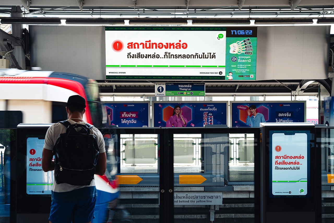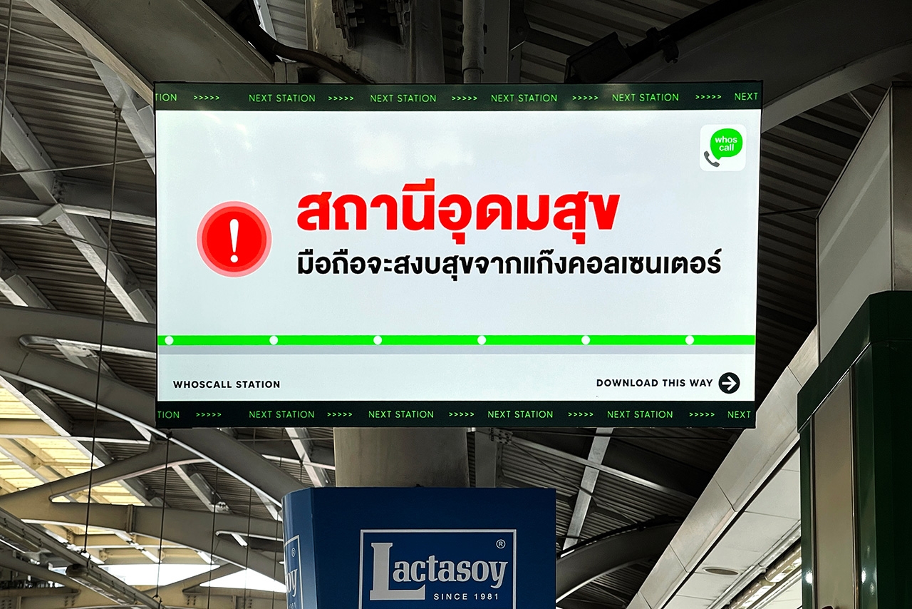 นอกจากนี้ทาง Whoscall ยังร่วมมือกับ VGI ผู้นำด้านสื่อโฆษณานอกบ้านของประเทศไทย และเอเจนซี่โฆษณาสุดจี๊ด SOUR Bangkok เมื่อประชาชนทั่วกรุงเทพฯ ขึ้นรถไฟฟ้า กลับได้ยินเสียงประกาศที่เปลี่ยนไป เล่นมือถืออยู่ดีๆ ถึงกับต้องเงยหน้าขึ้นมาฟัง! เพราะแทนที่จะได้ยินเสียงประกาศแจ้ง ‘สายรถไฟ’ ปกติที่คุ้นเคย กลับเป็นเวอร์ชันใหม่สะดุดหูที่เปลี่ยนตามโลเกชันจริงไม่ซ้ำกัน เช่น